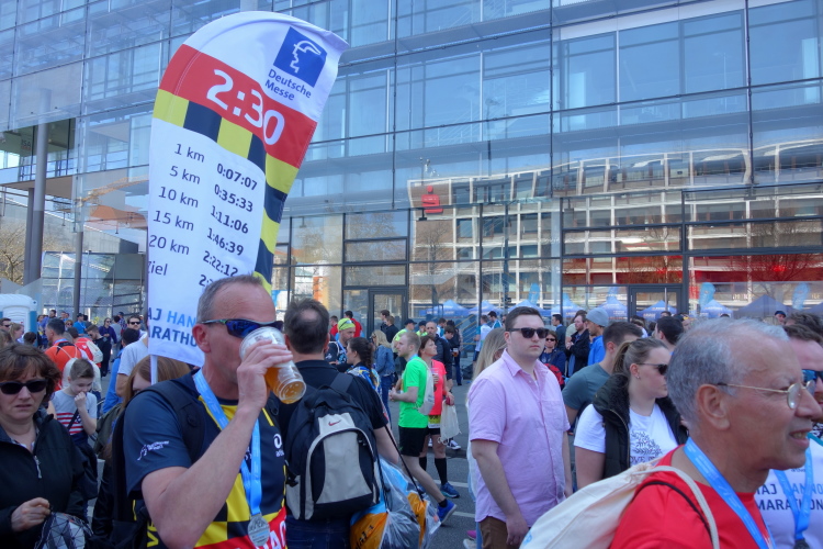 Ich habe mir vorgenommen, hinter den 4:30 Pacemakern zu bleiben. An ihren großen, gelben Ballons, einer Flagge sowie den auffallenden Shirts sind sie leicht zu erkennen. Die schönen Inselterrassen am Südufer des Maschsee kommen in Sichtweite. Ich schaue angestrengt nach vorn, dann entdecke ich den gelben Ballon, allerdings nicht auf der Strecke, sondern hinter einer Werbetafel. Auch ein Zugläufer muss mal …. Dumm nur, dass sich der Ballon danach an besagter Tafel verfranst, sich von der Halteschnur löst und himmelwärts davonfliegt. Na toll, meine angestrebte Zielzeit löst sich gerade in Luft auf! Der Tempomacher zuckt kurz mit den Schultern („shit happens!“) und rennt weiter.
