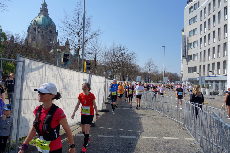 Ich biege rechts ab, blicke unvermittelt auf die Niki-de-Saint-Phalle-Promenade, Ernst-August-Platz und Hannover Hauptbahnhof. Als einzige deutsche Großstadt hatte Hannover bis 1847 keinen Kopfbahnhof, daher bekam die Stadt den ersten Durchfahrts-Bahnhof des Kontinents. Durch Hannover „fährt man durch“, sagte man spöttisch. Jahre später erkannten die Großstädte, dass ein Durchfahrts-Bahnhof doch vorteilhaft ist. Hannover galt als Vorreiter, vor allem, weil sich der Straßen- und Bahnverkehr nicht mehr kreuzte. Hier bei km 14,5 befindet sich auch die zweite, großräumig abgesperrte Wechselzone für die Staffelläufer.