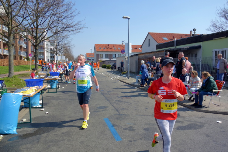 Vor uns taucht der erste VP bei km 4,2 höhe Riepestraße auf. Insgesamt warten heute fünfzehn Erfrischungs – und Verpflegungspunkte auf alle Teilnehmer. Die Halbmarathonläufer werden später hier abbiegen, wir laufen weiter geradeaus, auf den schwarzen Weg und mitten hinein in die grünen Felder der Leinemasch. Ich kippe mir lediglich einen Becher Wasser in den Rachen, renne dann unterm Südschnellweg durch. Wir laufen am Maschpark entlang, umrunden die Leineinsel, eine Flussinsel im Stadtteil Döhren. Heute befindet sich auf der Insel eine Wohnsiedlung mit rund 1000 Wohnungen. Im Kleingärtnerverein „Im Apfelgarten eV“ herrscht wie immer ausgelassene Stimmung! Auf beiden Seiten stehen die Kleingärtner und feuern uns mit Trillerpfeifen, Kuhglocken und großem Applaus an. Ein toller Streckenabschnitt, jedoch viel zu schnell vorbei.  Nun wird es wieder zunehmend städtischer, wir nähern uns dem Stadtteil Wülfel.