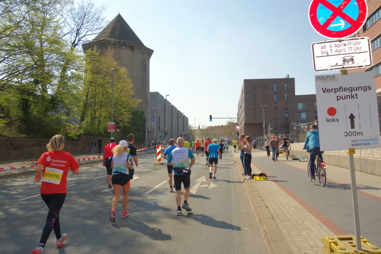 Wenig später schon befinde ich mich auf  der Hildesheimer Straße, die längste Streckengerade des Hannover-Marathon. Es ist faszinierend, wie viele Aktionspunkte allein auf diesem Streckenabschnitt auf Sportler und Zuschauer warten. Die Funkenartillerie Blau-Weiss, der hannoversche carneval club und die Leinespatzen Stadtgarde Hannover sorgen am Döhrener Turm mit Musik für die richtige Party-Stimmung. Der 1382 gebaute Turm gilt als wichtige Landmarke Hannovers, er wurde als Teil der Hannoverschen Landwehr mit etwa 17.000 Mauer-und Dachsteinen errichtet. Ich sehe einige Zuschauer bereits ein Bierchen süppeln – auch anfeuern macht offenbar durstig. Für einen guten Laufrhythmus und optimale Schrittfrequenzen sorgen Trommel- und Sambagruppen. Die treibenden Beats verschiedenster DJ's peitschen uns Athleten  stetig nach vorn und heizen die Zuschauer musikalisch ein. Ein wahrer Lauf-Rausch auf diesem 6 km langen Streckenabschnitt, beginnend in Döhren-Wülfel über Südstadt-Bult bis hinauf zum Aegidientor, welches seit dem Mittelalter das südöstliche Stadttor der Stadtbefestigung Hannovers gewesen ist. Zur linken taucht zunächst das Braukesselhaus auf, gefolgt von der Gilde-Brauerei.
