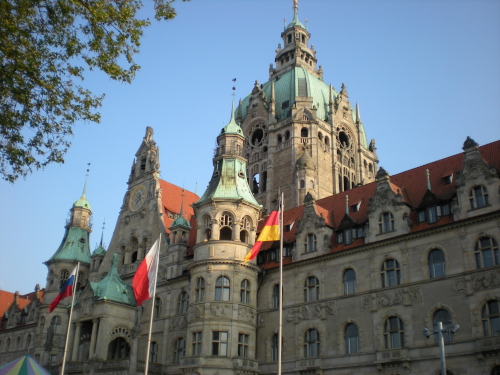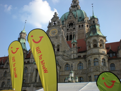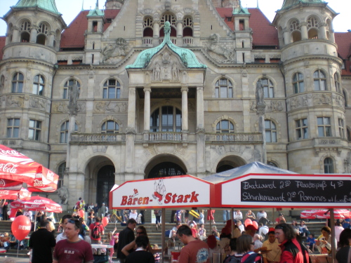Die Marathonmesse ist im Zelt am Neuen Rathaus. Das Neue Rathaus ist gar nicht so neu, sondern von 1913 und verdammt gutaussehend, mit imposanter Kuppel, unter der sich der Nachmeldeschalter befindet. Vor dem Rathaus bereiten sich erstaunlich viele Briten bei Bratwurst und Bier auf den Marathon vor. Familiäre Verbindung der Welfen machen´s möglich.