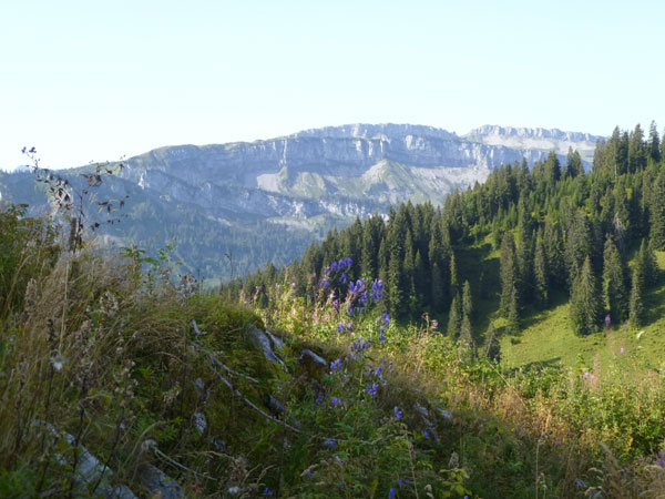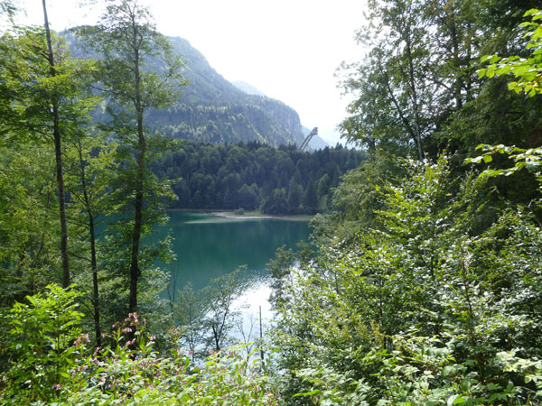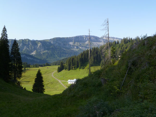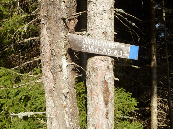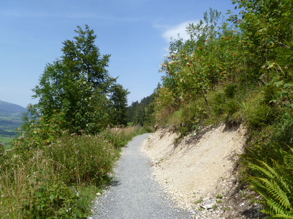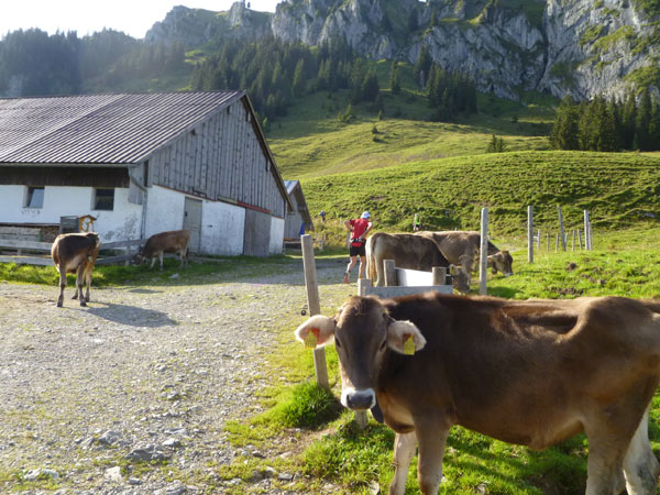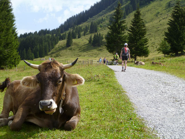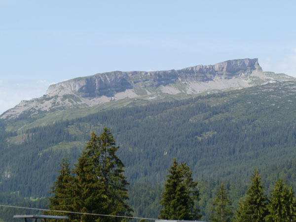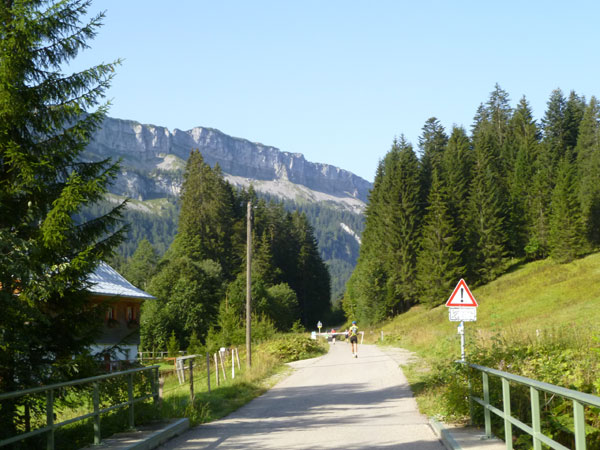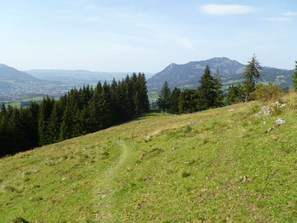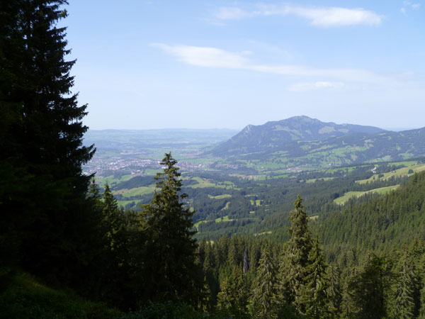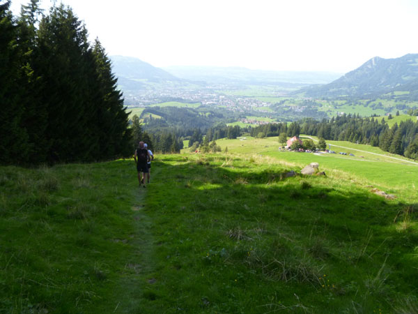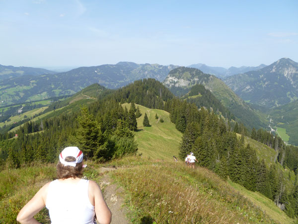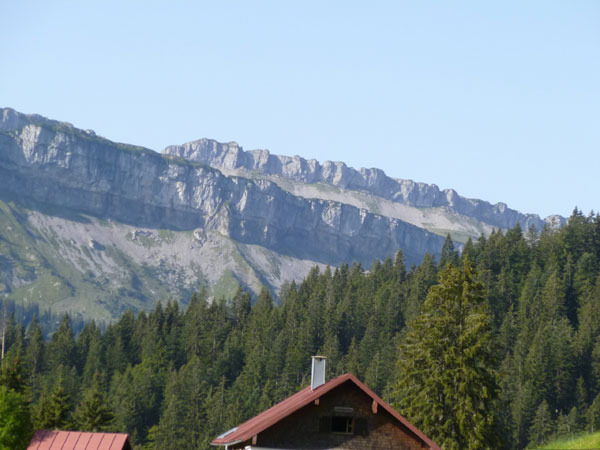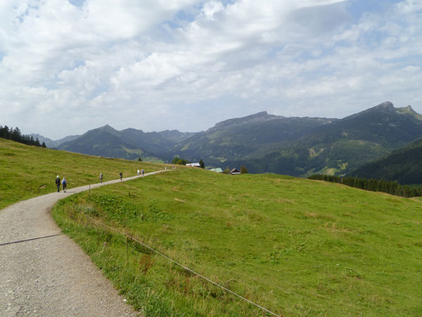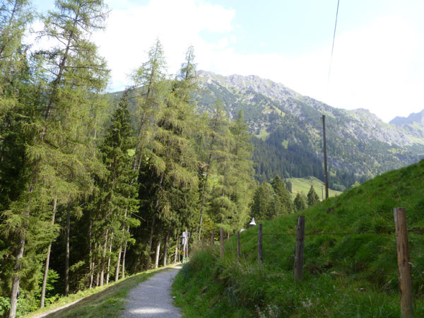 Nach der mächtigen Brücke über die Breitach überqueren wir bei Km 35 die Hauptstraße des Tals und begeben uns wieder nach oben. Brütend heiß ohne Schatten führt der Wanderweg Richtung Söllereckbahn Bergstation. Aber dafür bekommen wir noch einmal eine spektakuläre Aussicht auf die seltsamen Mauern der Gottesackerwände. Mit dem Stock des Hohen Ifen (2.230 m) stellen sie eines der interessantesten Alpengebiete dar.