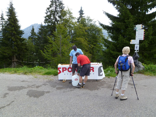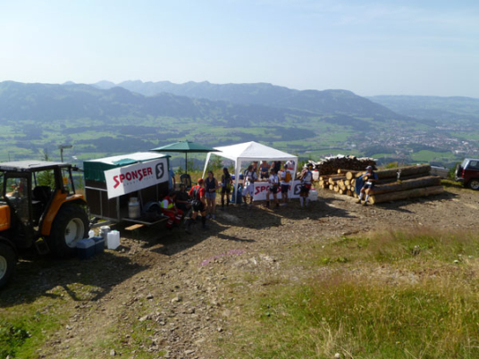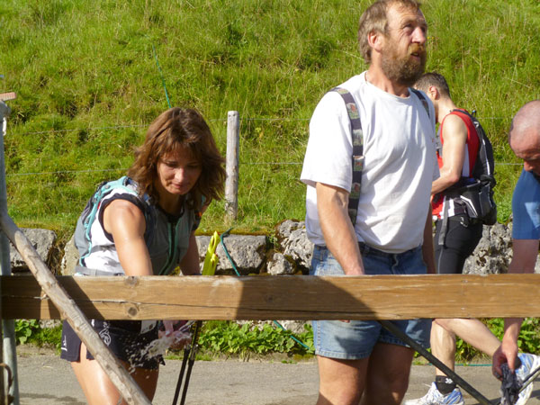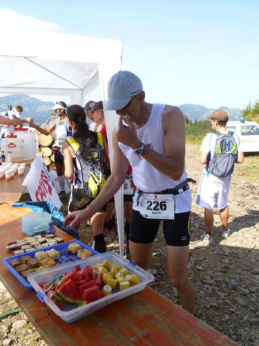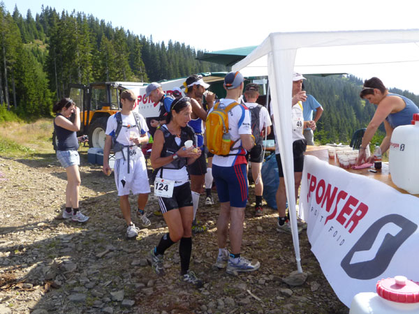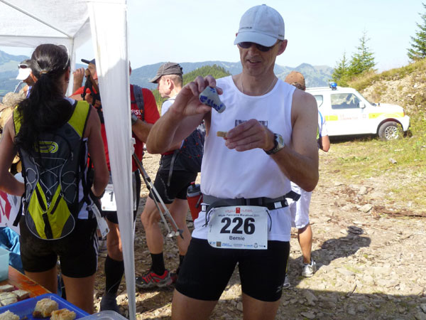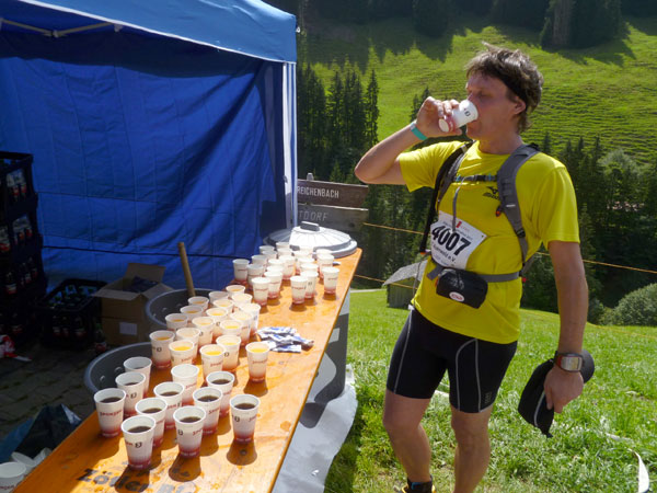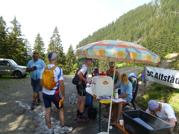 Am sehnsüchtig erwarteten Gipfel (Km 60) wird dafür jeder mit einem Becher Wasser begrüßt. Mühsam haben einige Helfer diverse Liter mühevoll noch oben gebracht, um uns die nötige Erfrischung anbieten zu können.