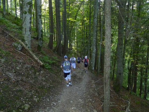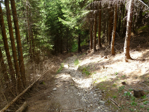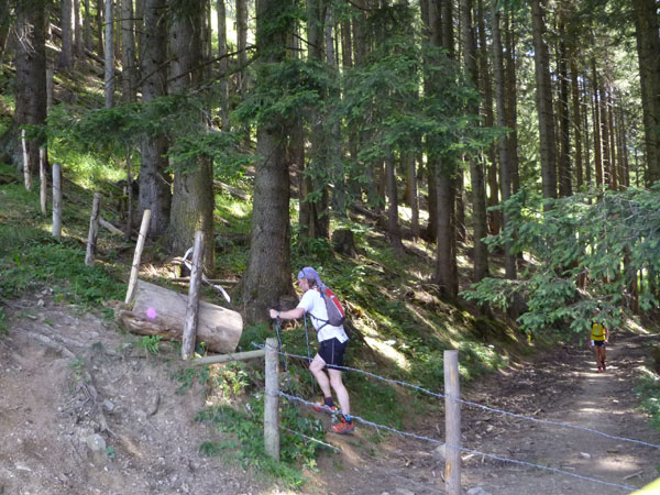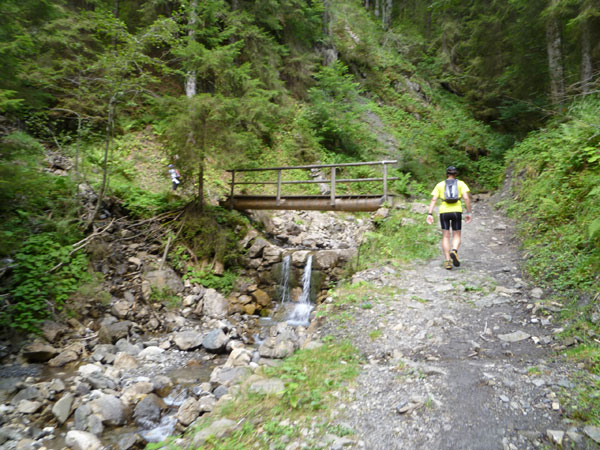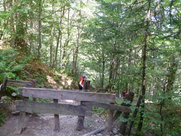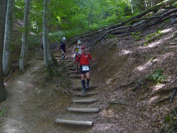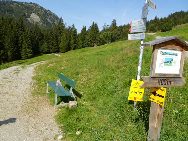 An der Söllereckbahn wartet wieder Trinkwasser auf uns und nach einem kurzen Kletterstück geht es runter ins Tal. Fast durchgehend gut zu Laufen führt unsere Route über Kiesstraßen, steile Wurzelpfade und Waldwege, meist im schattigen Wald auf einer Länge von über 5 km nach unten.
