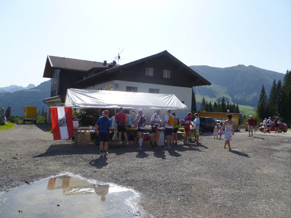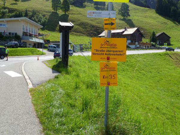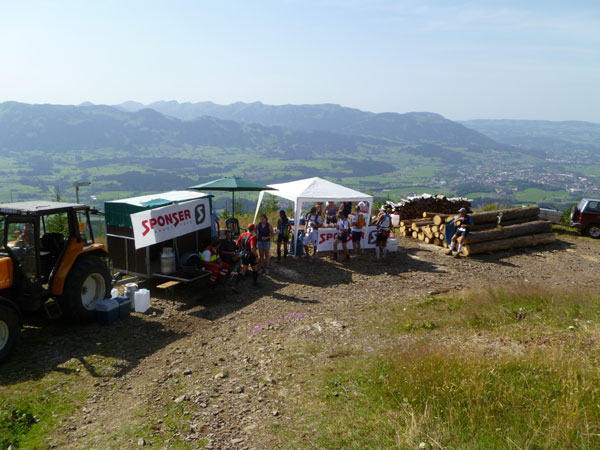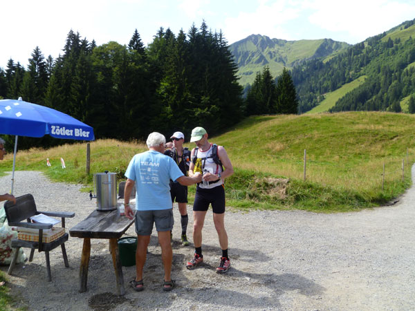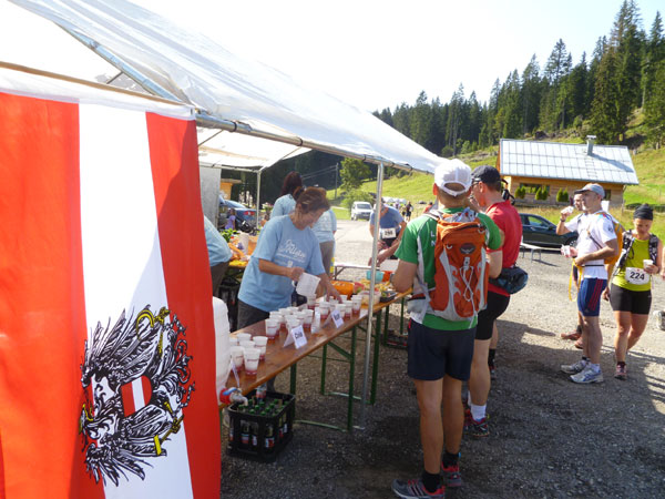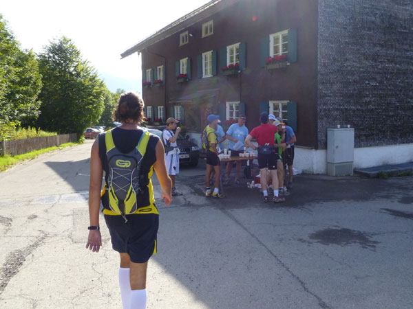 Kurz vor Halbzeit unseres Laufes überschreiten wir die Grenze ins österreichische Bundesland Vorarlberg. Am Gasthof Hörnlepass ist eine große Versorgungsoase für uns aufgebaut. Hier werden wirklich alle Wünsche, von süß bis salzig erfüllt. Am Start konnte man einen „Special-Need-Beutel“ mit frischen Klamotten abgeben und hierher transportieren lassen. Viele haben das im Vorjahr genutzt und nach Kreuzen des Moors die eingesauten Schuhe gewechselt. Das haben wir heute nicht nötig.