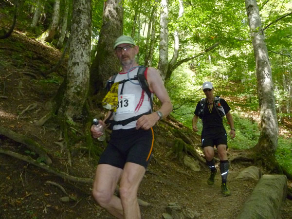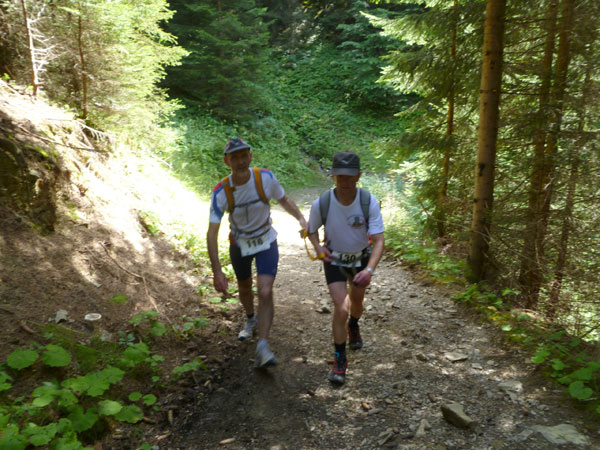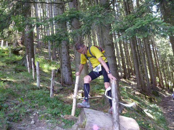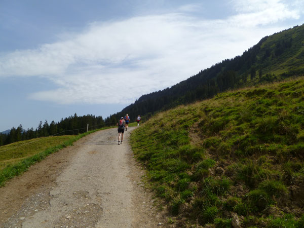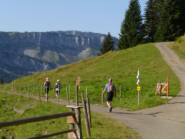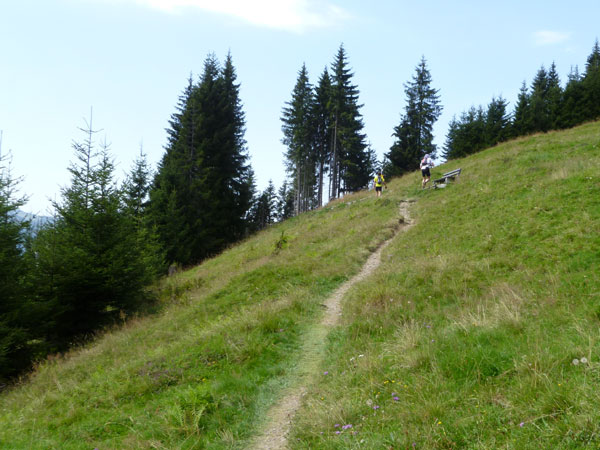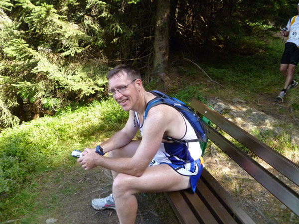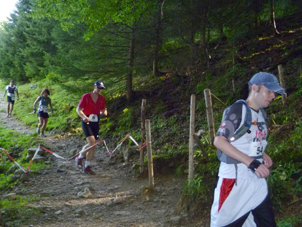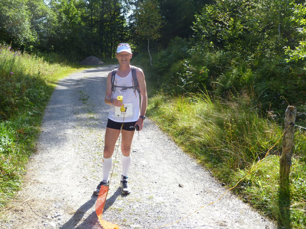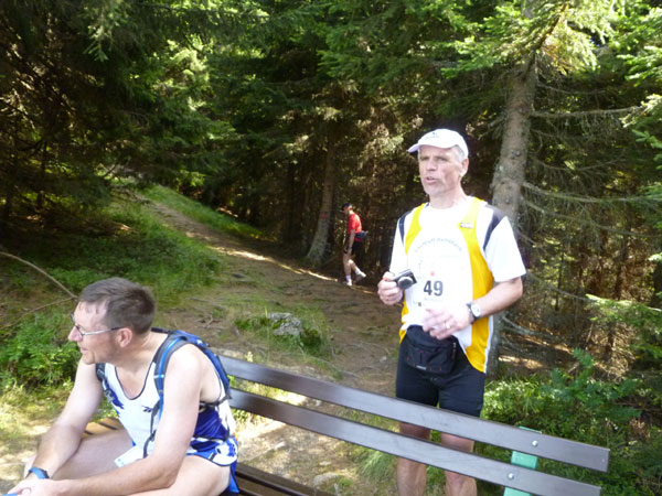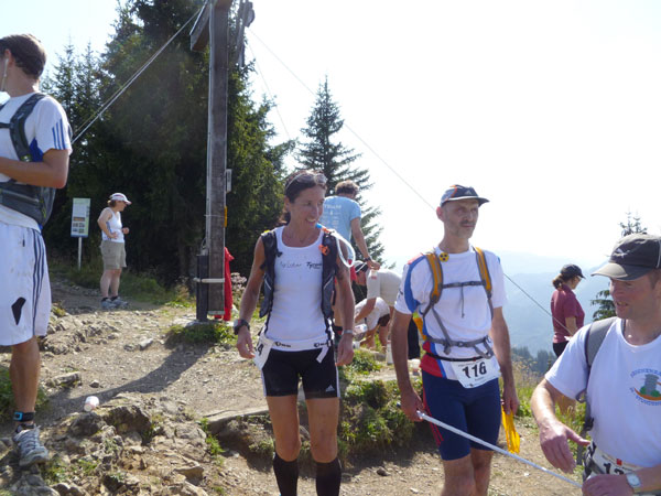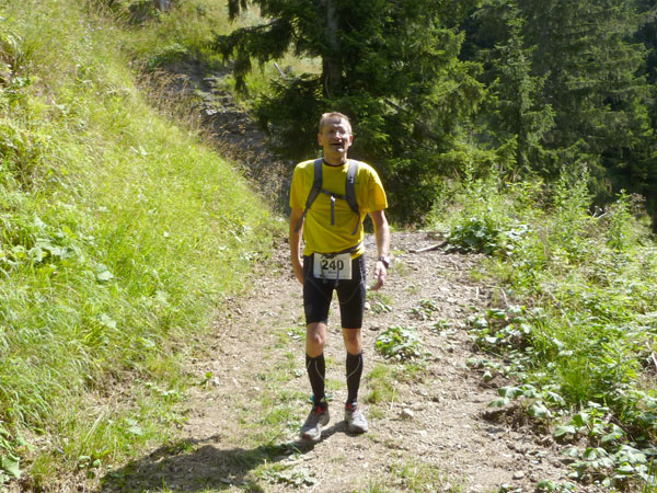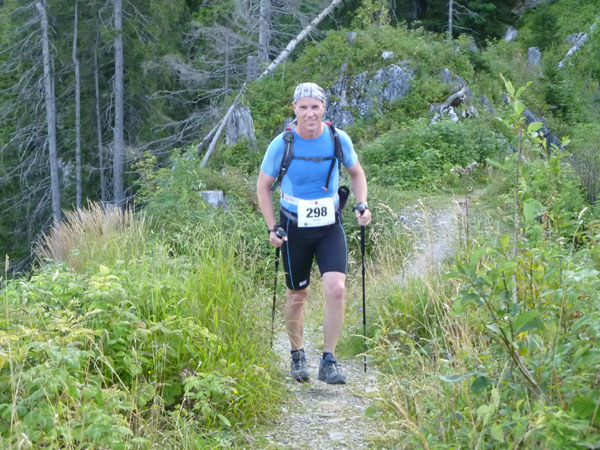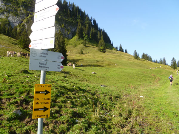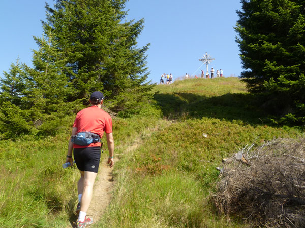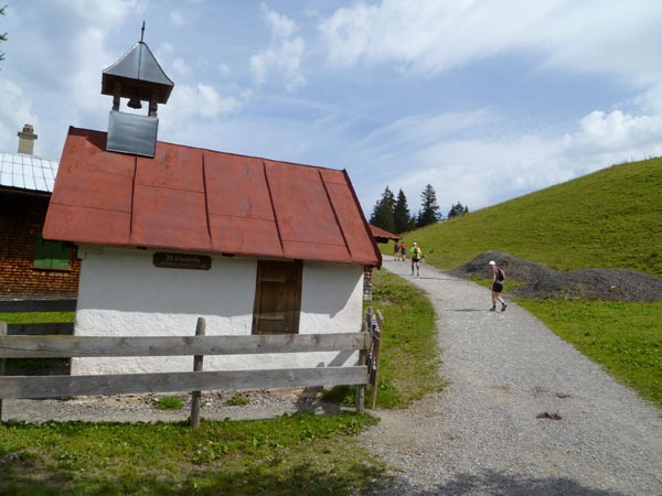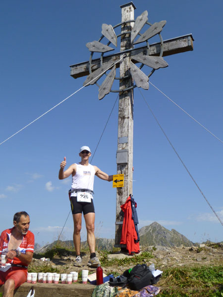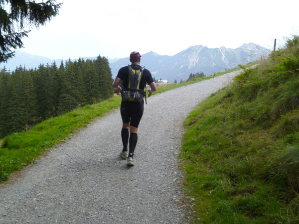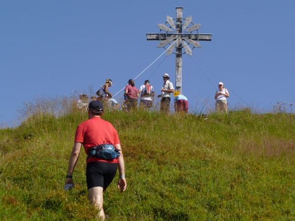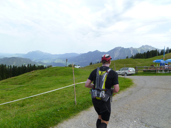 Das härteste Stück Arbeit des UT ist der ca. 10 km lange Anstieg über die Gaisalpe zum Sonnenkopf. 1000 Höhenmeter gilt es von Oberstdorf bis zum Gipfel zu meistern. Obwohl der Sonnenkopf eigentlich im Allgäu keine große Nummer ist, hat er bei den APM-Teilnehmern einen legendären Ruf erlangt und wurde schon mit den schlimmsten Verwünschungen belegt. Mario kann ich bald abfangen, ein Stückchen legen wir noch gemeinsam zurück, dann zahlt sich meine anfängliche Zurückhaltung aus und ich kann mich absetzen. Die letzten beiden Kilometer unterhalb des Gipfelkreuzes sind die anspruchsvollsten und setzen jedem zu, sie sind mit Sicherheit das Kriterium des Ultra Trails.