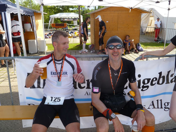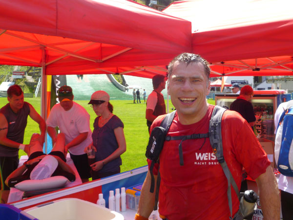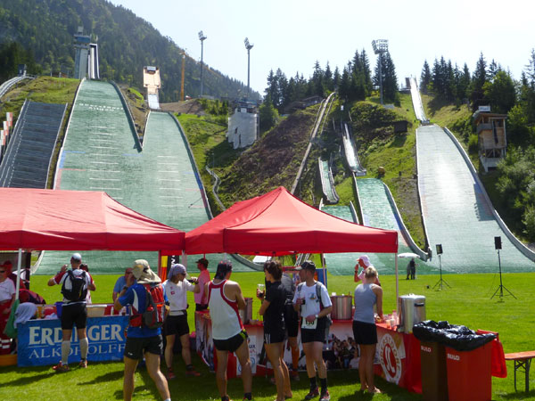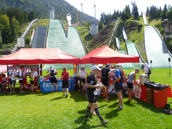 Die Cut-Off-Zeit ist im Skisprungstadion auf 8:15 Std. angesetzt, wer später eintrifft oder nicht mehr weiterlaufen mag, kommt in eine eigene Wertung und bekommt auch eine APM-Medaille. 37 Läufer/innen machen heute von der Ausstiegsmöglichkeit Gebrauch. Ich nehme mir Zeit für eine ausgiebige Stärkung und ein wunderbares Erdinger Alkoholfrei. Einen zweiten Becher nehmen sich Dirk und ich noch beim Verlassen zur Wegzehrung mit. Auf Mario habe ich jetzt 12 Minuten Rückstand, schau mer mal was da noch geht.