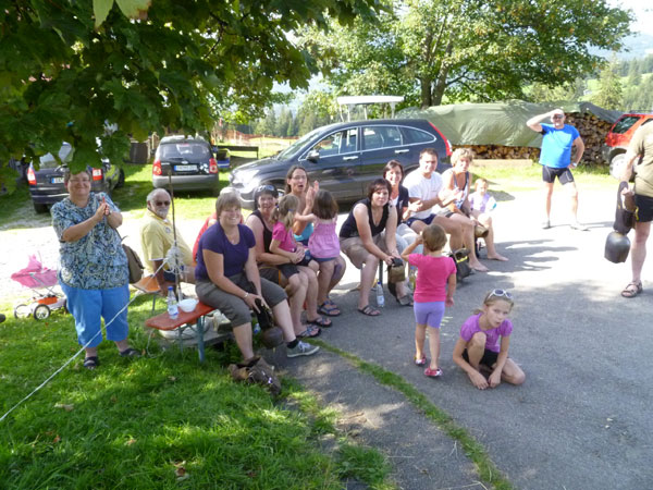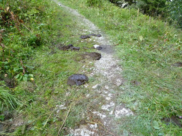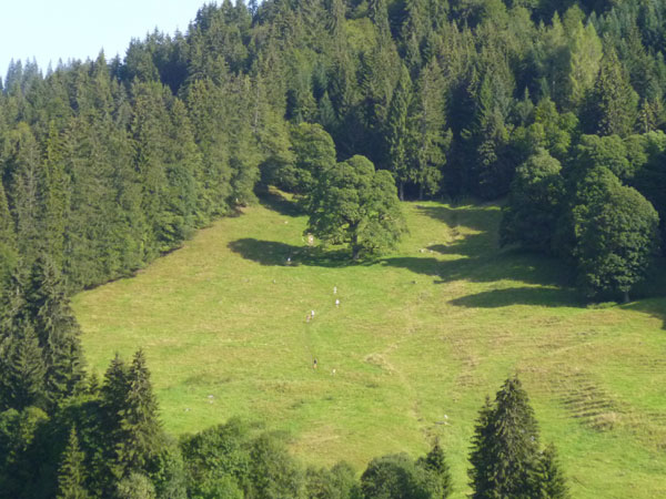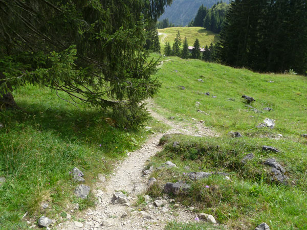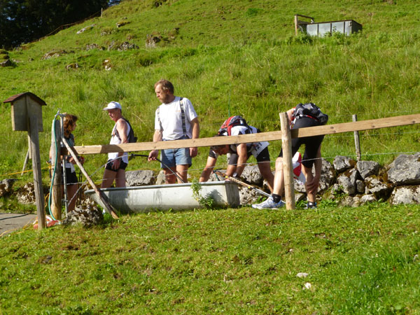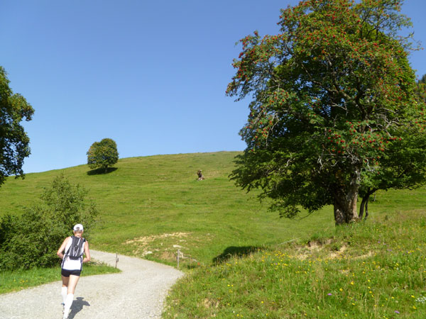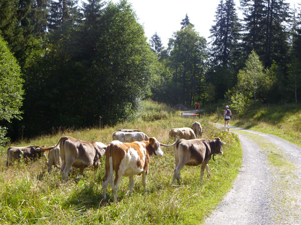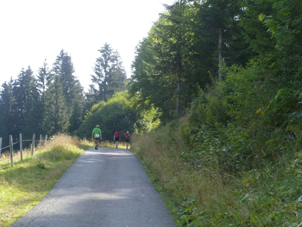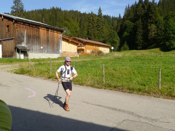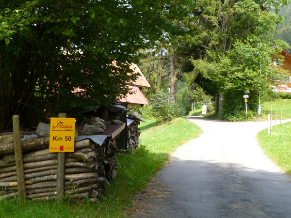 Nach dem Durchqueren des Wäldchens trennen sich die gemeinsamen Wege von Trailern und Marathonis. Für uns geht es nach rechts weiter. Über einige steile Bergabstücke erreichen wir den Weiler Rohrmoos, wo es wieder Wasser zum Nachtanken gibt.