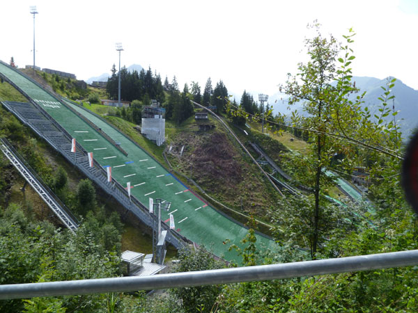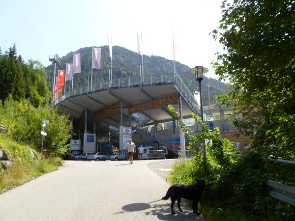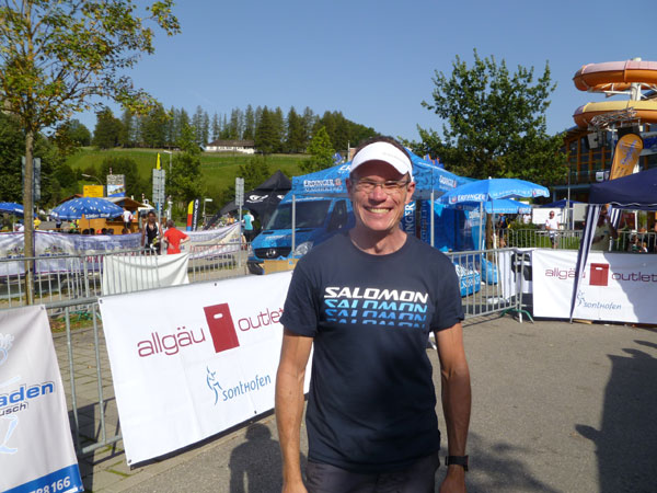 Bis Oberstdorf sind ab Waldende noch drei Kilometer in der Ebene, meist in der prallen Sonne zurückzulegen. Ja, heute ist Sommer …und was für einer, da schmilzt dir fast das Hirn in der Birne so hat sich die Hitze im Tal gestaut. Nach gut 7 Stunden laufe ich in die Erdinger Arena (Km 49) ein und sehe am Ausgang gerade noch Mario entschwinden. Eigentlich wollten wir heute gemeinsam laufen, aber nach meinen ersten Fotostopps hat er sich schnell abgesetzt. Meine Pause fällt daher etwas kürzer aus als eigentlich vorgesehen, um ihn noch einzuholen.