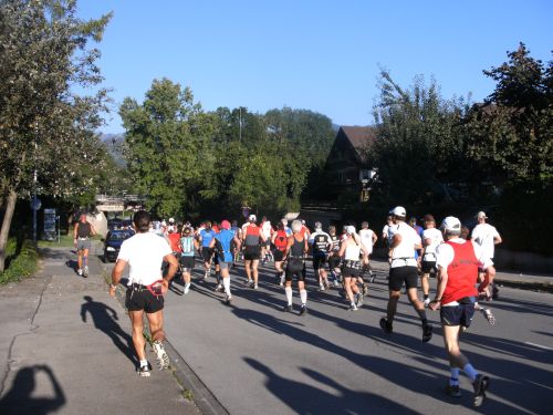 Pünktlich um 8 Uhr fällt der Startschuß. Es herrscht eine prächtige Stimmung unter den Läufern. Alle freuen sich auf einen schönen Lauf in spektakulärer Umgebung bei schönstem Wetter. Noch ist es nicht zu warm. Aber Kälte ist was anderes.