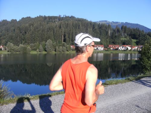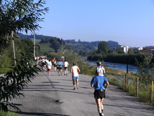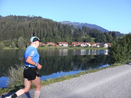 Durch die Immenstädter Straße laufen wir direkt zur Iller. Über eine kleine Brücke geht es sofort rechts ab und entlang des Flusses. Am Sonthofen See spiegeln sich die Häuser von Oberzollbrücke und die Wälder der umgebenden Hügel im ruhigen Wasser. Wind haben wir keinen. Erst nach dem Lauf wird das erste zaghafte Lüftchen spürbar.