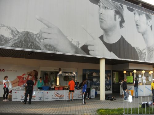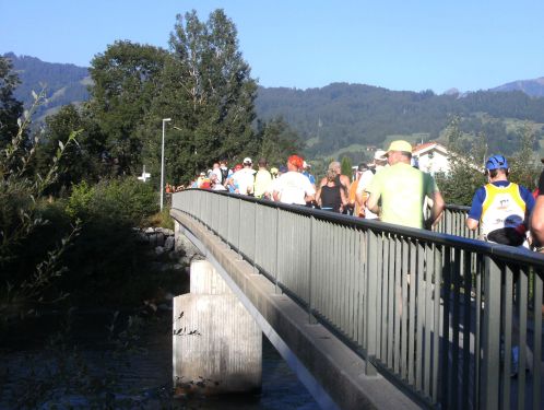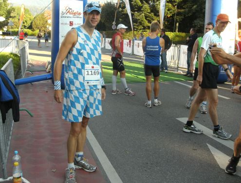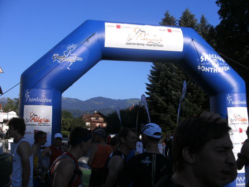 Wie Samstag so haben wir auch am Sonntag schönstes Sonnenwetter. Keine Wolke zeigt sich am Himmel. Beim Frühstück denke ich an die Ultras, die schon um 6 Uhr in der Früh zu ihren 69 km aufgebrochen sind. Wir haben noch etwas Zeit. Der Marathonstart ist um 8 Uhr. Kurz nach 7 Uhr gehen wir ruhigen Schrittes durch das noch schlafende Sonthofen zum Allgäu Outlet. Hier ist noch nicht viel los. Kein Wunder, von den über 700 Startern wollen nur knapp unter 200 den Marathon laufen. Beim Halben sind es über 300 Läufen, Ultras gibt’s es knapp über 200. Da die Ultras schon weg sind und die Halben erst um 9.15 Uhr starten werden ist es recht ruhig.