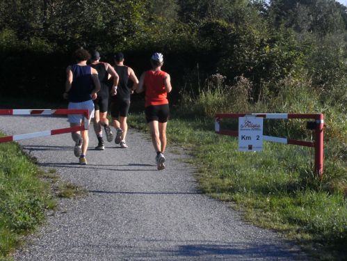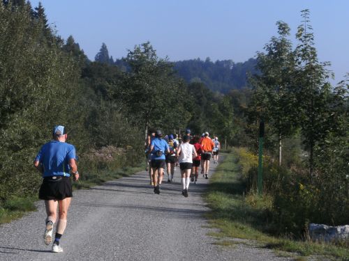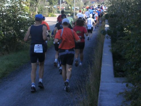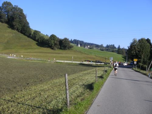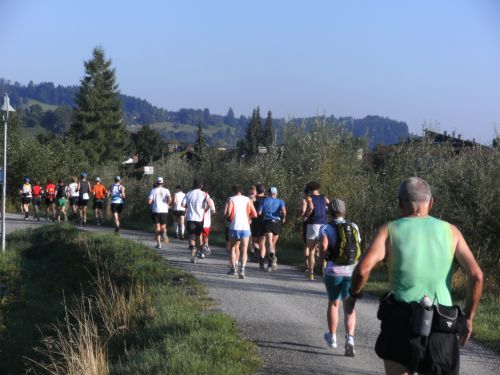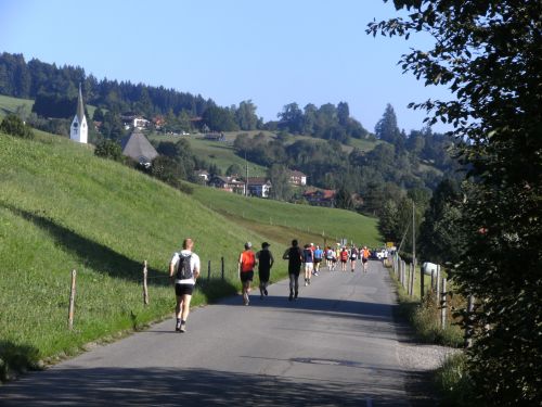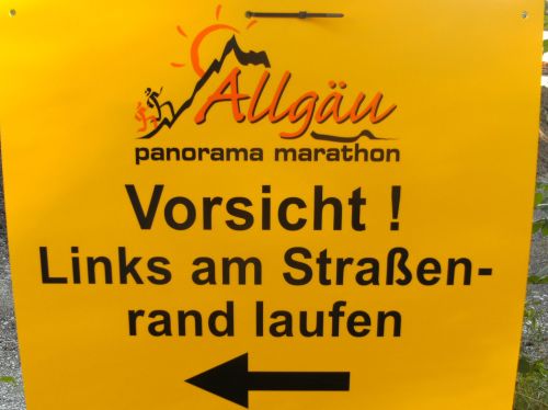 Am Ende des Sees ist km 2 erreicht. Es geht ein kurzes Stück auf einer Straße bis zum Ortsanfang von Bihlerdorf. Ein Schild bittet die Läufer links am Straßenrand zu laufen. Umsichtig. Man merkt an solchen Kleinigkeiten, wie sehr die Veranstalter an alles gedacht haben und den Lauf wirklich perfekt organisiert haben. Ein Lob den Organisatoren um Axel Reusch vom Laufladen in Sonthofen und Christian Feger vom Sonthofer Skiclub. Zusammen mit den vielen engagierten und zuvorkommenden Helfern in den dunkel violetten Shirts habt ihr eine tolle Veranstaltung auf die Beine gestellt.
