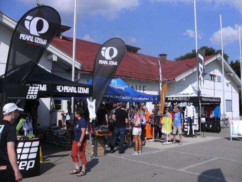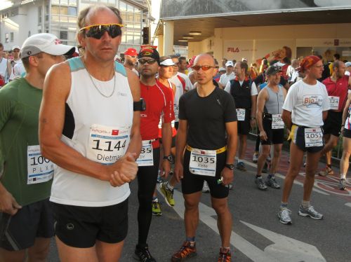 Wir geben unsere Kleiderbeutel ab. Sie werden ins 800 m entfernte Ziel am Erlebnisbad Wonnemar gefahren. Wer mag kann noch nachmelden. Die Zeit bis zum Start nutzen wir zu einem Schwätzchen. Klar, dass wir auch Anton wieder treffen.