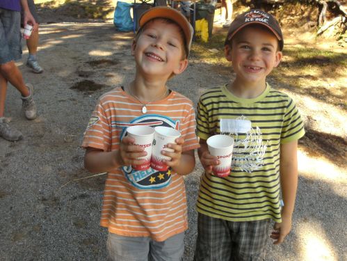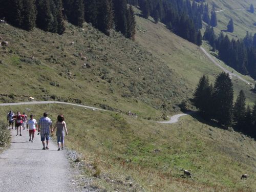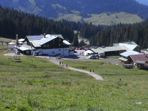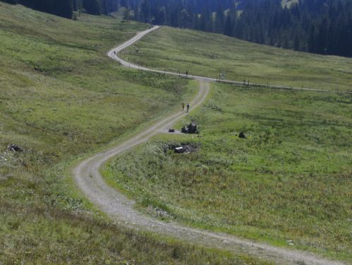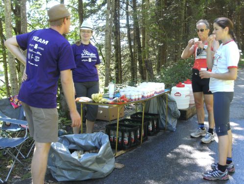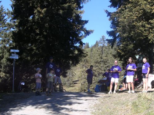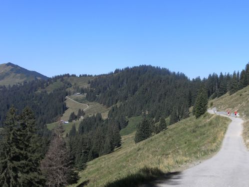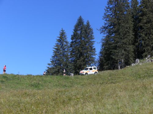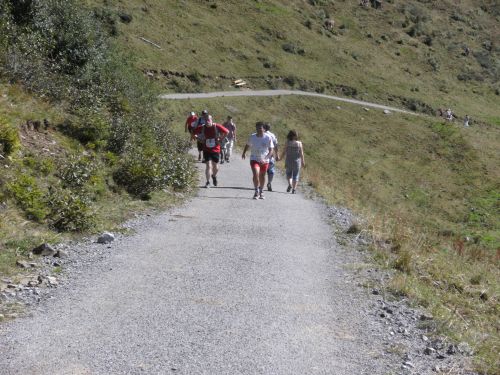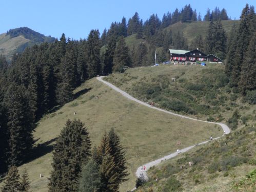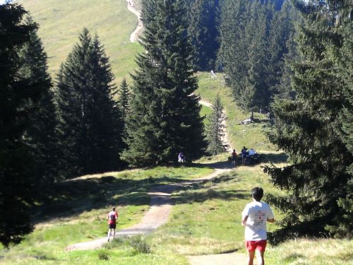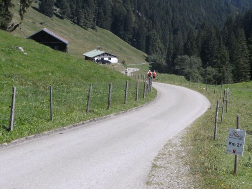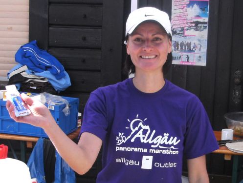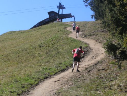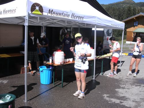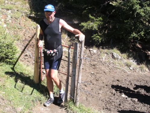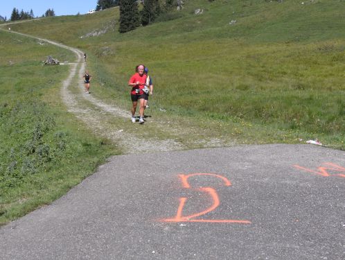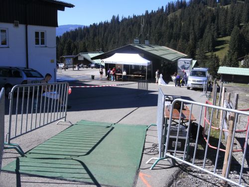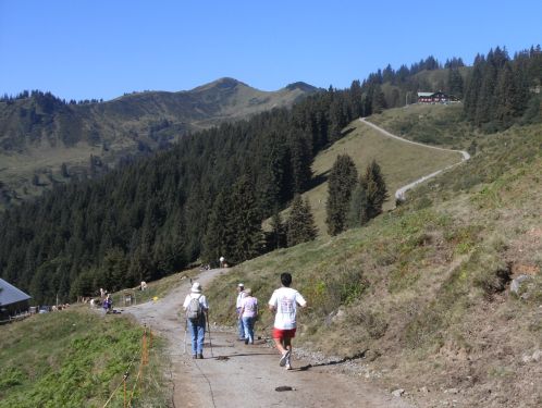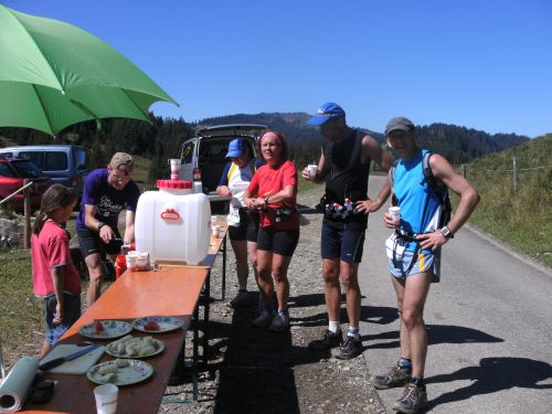 Wieder einmal wartet ein weithin sichtbarer Teil der Strecke auf uns. In der Ferne sehen wir das Berghaus Schwaben. Hier ist im Schatten wieder eine Verpflegungsstelle und freundliche Helfer warten auf die Läufer. Zwei prächtige junge Burschen wetteifern darum, mir ein Getränk zu reichen.