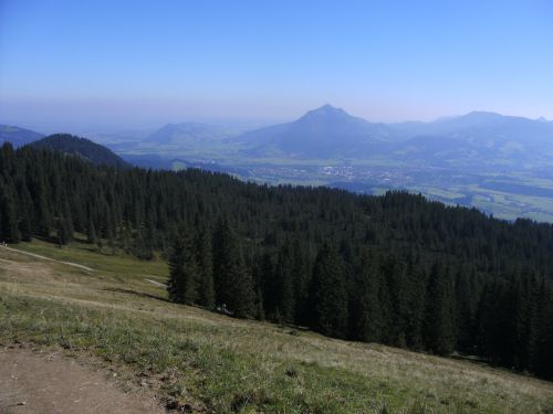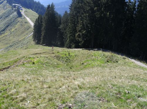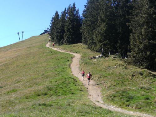 Noch ist aber erst etwas weniger als ein Viertel des Laufes geschafft. Es steht der erste richtige Abstieg an. Beim Erreichen des Grats lassen wir die Hörner-Bahn-Station gerade aus vor uns liegen und biegen rechts ab.