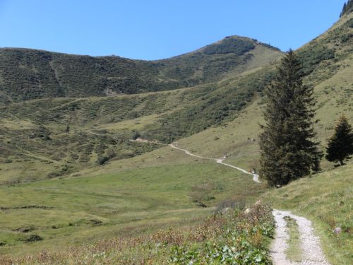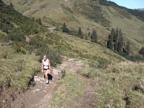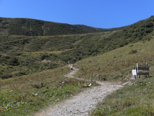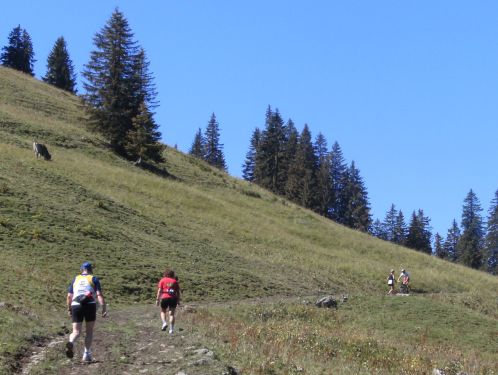 Ein weiterer Aufstieg und hinab geht’s Richtung Ginigörgen-Alpe. Kurz vor der Alpe trennen sich die Wege der Ultras und der Marathonis. Ich laufe heute links Richtung Lochbachtal. Im nächsten Jahr habe ich mir fest vorgenommen, rechts herum zu laufen und den Ultra zu machen.