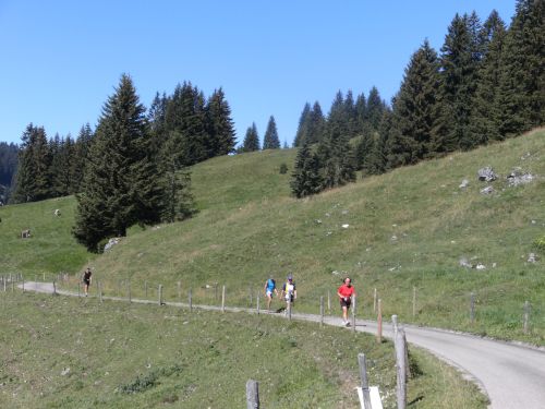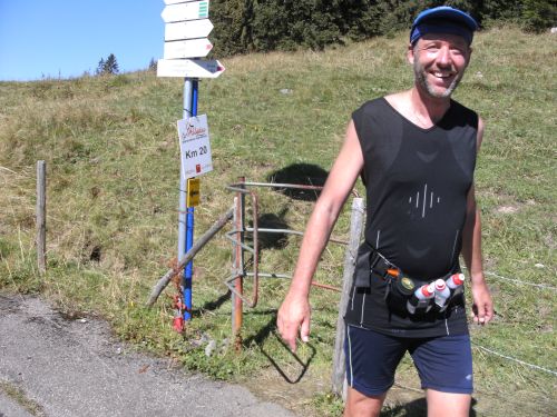 „Wir sind alle freiwillig hier und haben Spaß!“ Diesen Satz lasse ich zur Freude der Mitläufer und Helfer von mir und ernte unterschiedliche Reaktionen. Nicht jeder mag darüber lachen. Wie meine Mitläufer bin ich hier bei km 19 nicht mehr richtig frisch. Die vielen Höhenmeter haben Kraft gekostet, aber auch Spaß bereitet. In Grasgehren haben wir die meisten Höhenmeter aber bereits bewältigt und es geht abwärts.