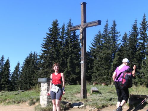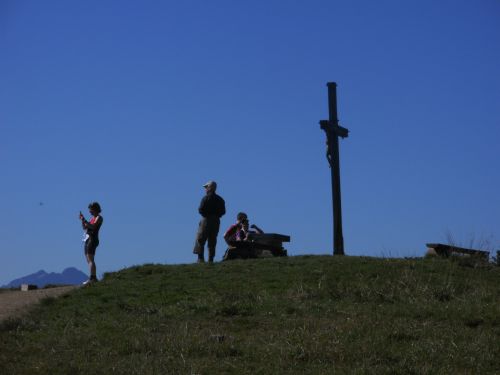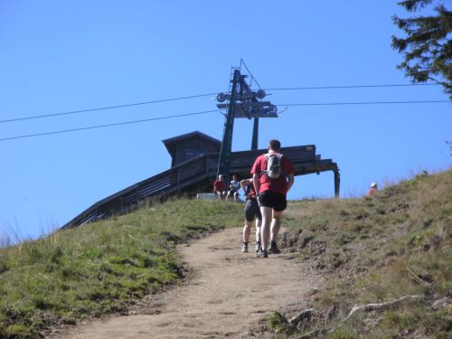 Nach dem Aufstieg erwartet uns auf dem Weiherkopf ein richtiges Gipfelkreuz. Oben endet auch der Weiherkopflift. Da hätte man doch auch einfacher hoch kommen können. Ich genieße die Aussicht. Wir haben einen herrlichen Blick in die Alpen hinein. Spätestens hier weiß auch der Letzte, warum der Lauf Panorama Marathon heißt.