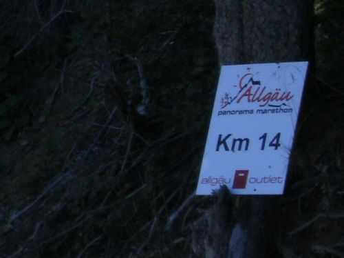 Bei km 20 kommen wir wieder auf Asphalt. Der Wirtschaftsweg führt zur nahen OA 9. Diese verlassen wir jedoch nach wenigen Metern wieder und laufen links ab. Kurz vor der Schönberg-Alpe passieren wir die Halbmarathonmarke. 3.18 Stunden, meine bislang langsamste erste Hälfte.