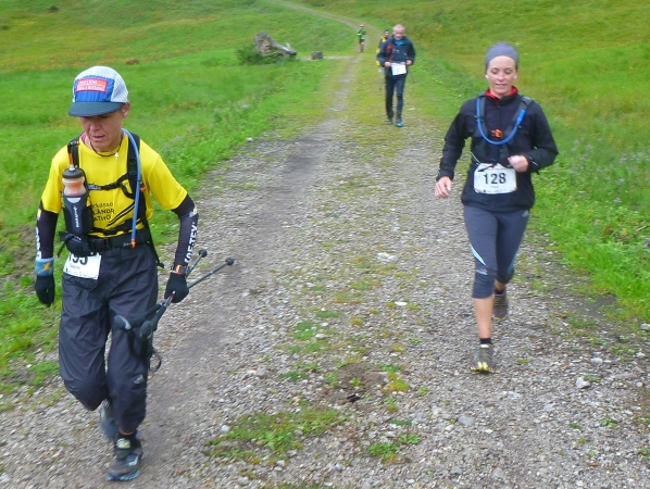 Wir laufen unterhalb des Riedbergerhorns. Man kann einen weiten Teil der vor uns liegenden Strecke überblicken. Das Läuferfeld sieht man weit verstreut. Ich kämpfe mich hinauf auf den Sattel und denke mir den Fernblick u.a. auf die Gottesackerwände einfach dazu.