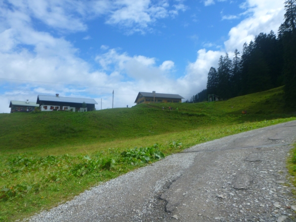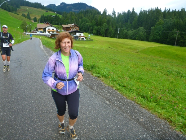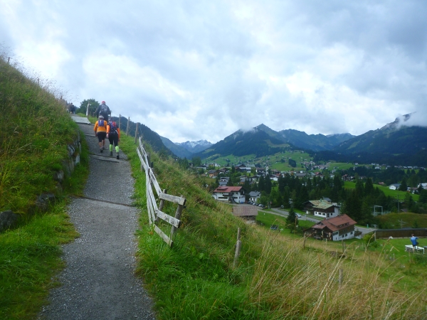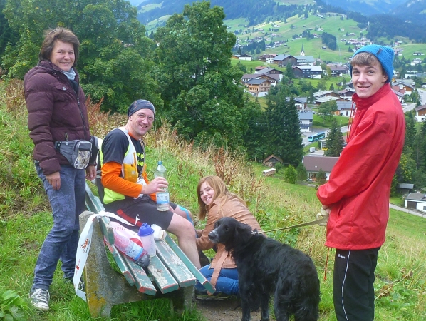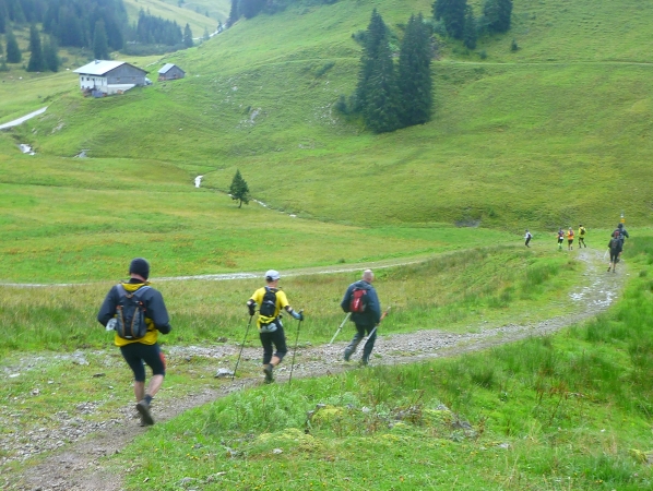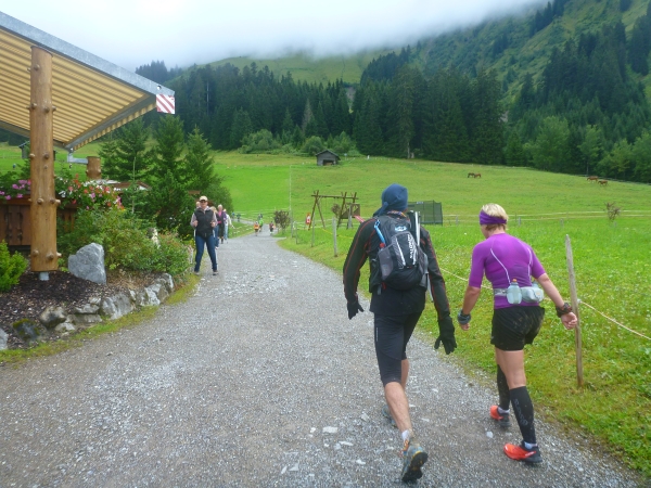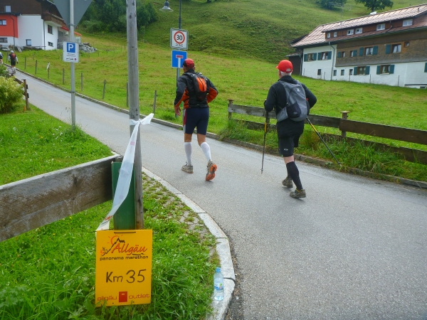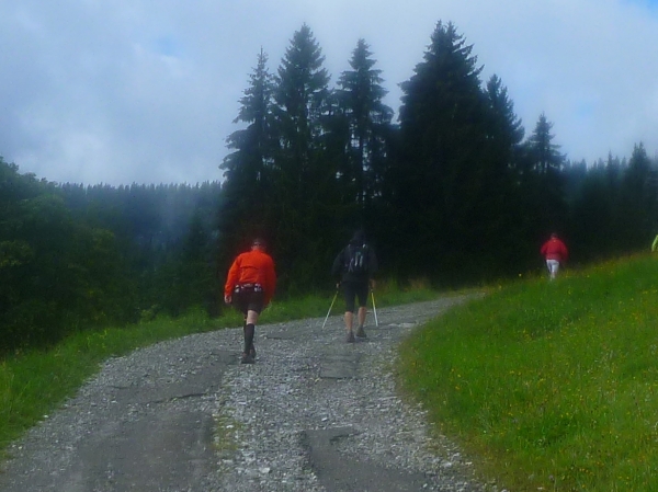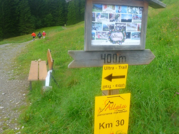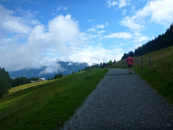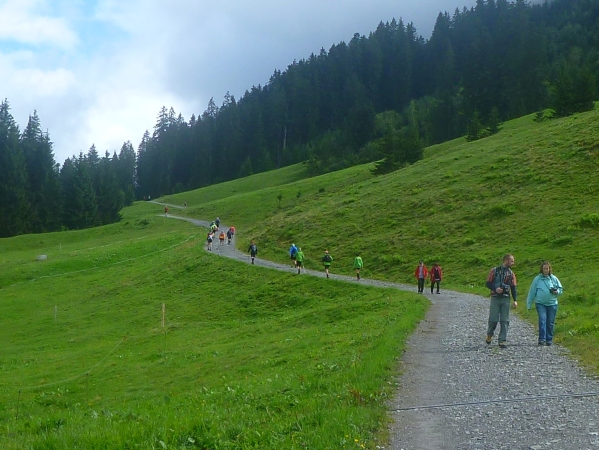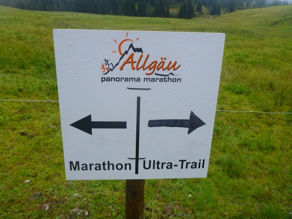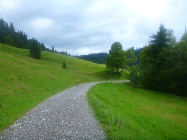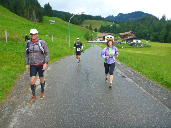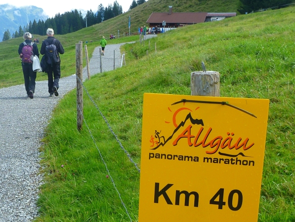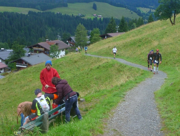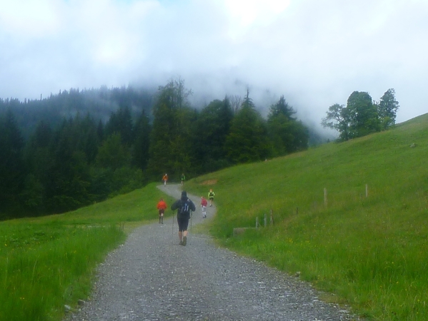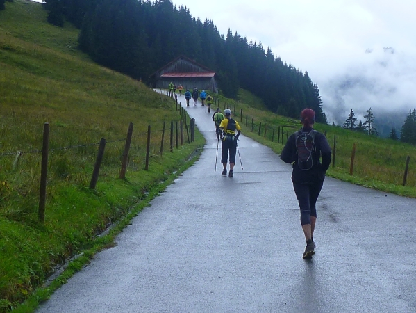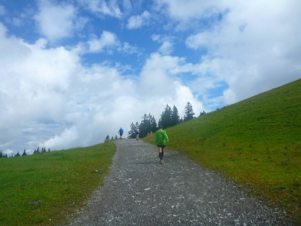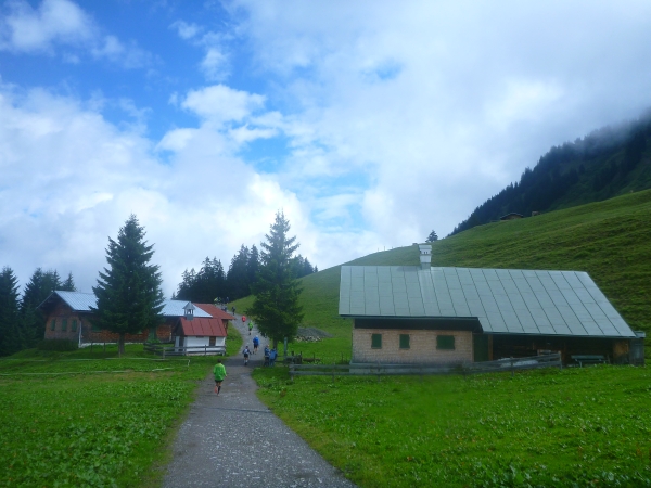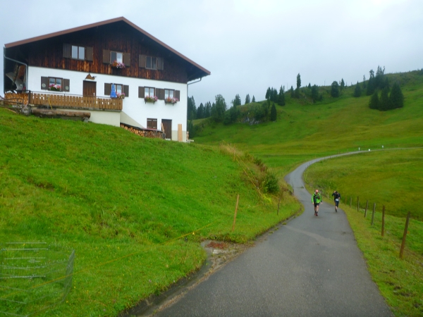 Wir haben die Hälfte geschafft. 35 von 69,3 Km sind absolviert. Ein satter Aufstieg liegt vor uns. Die Sonne kommt nun immer wieder hinaus, allerdings ist der Blick durch Wolken getrübt. Nix zu sehen von Hoher Ifen, Gottesackerwände usw.