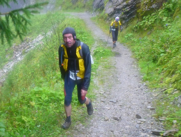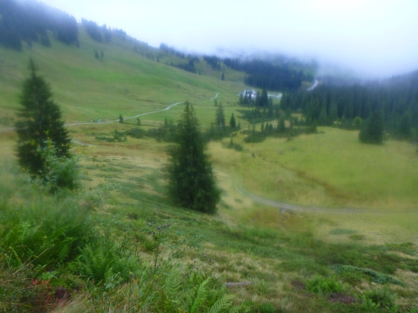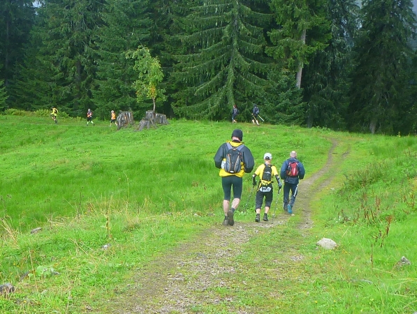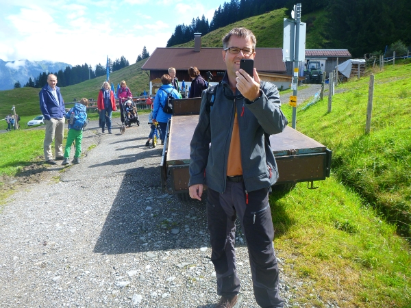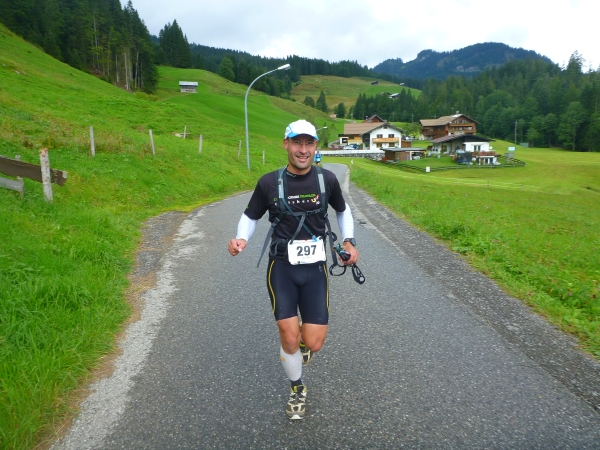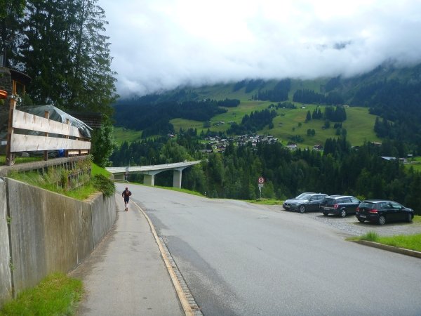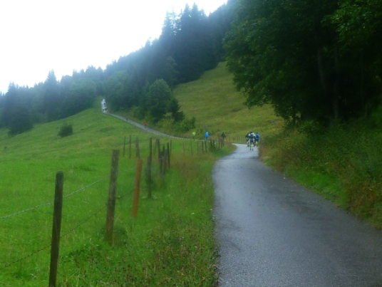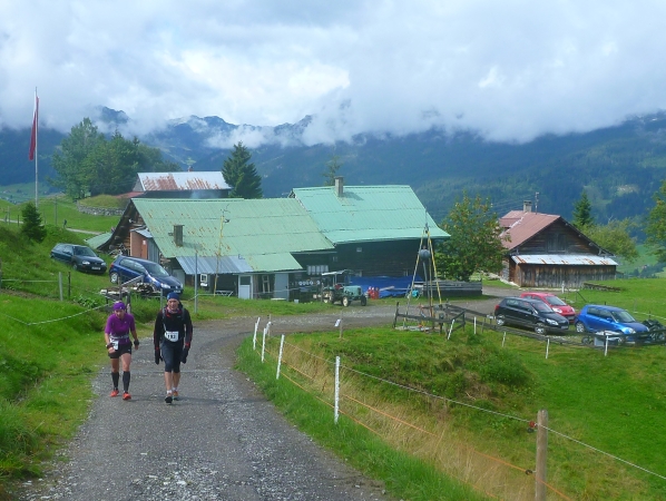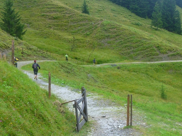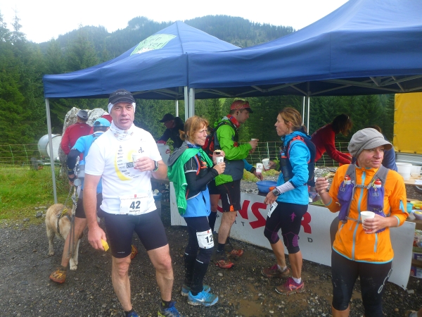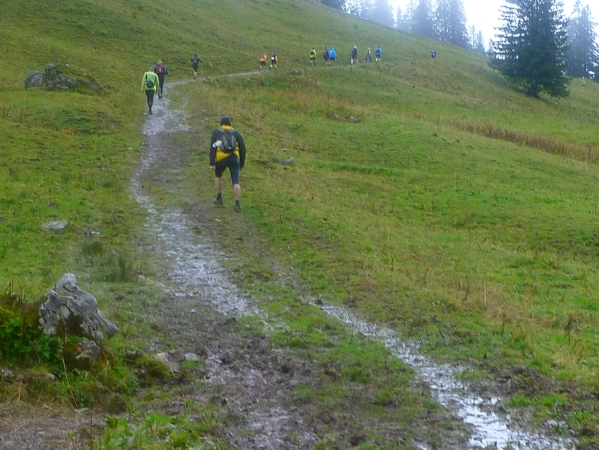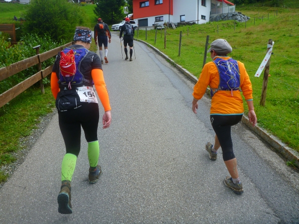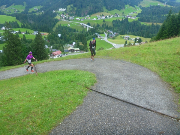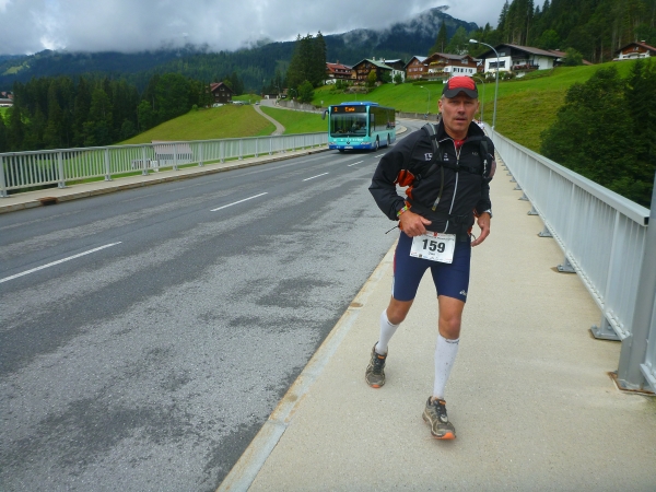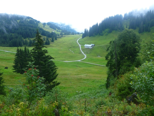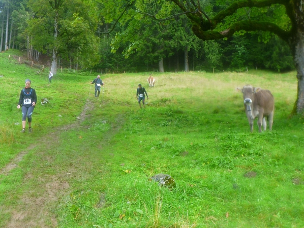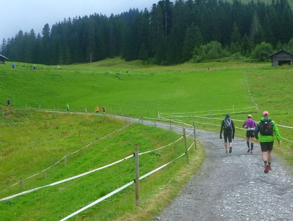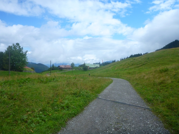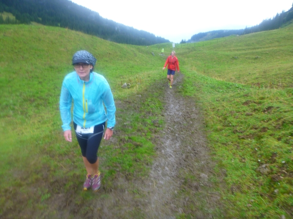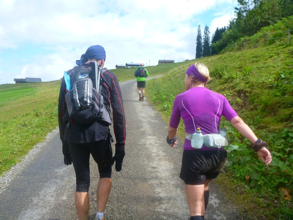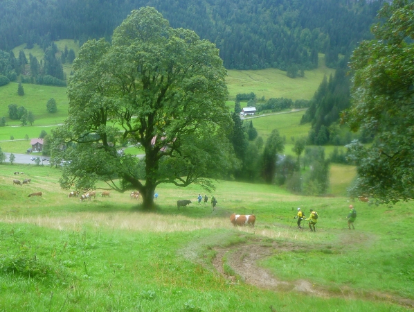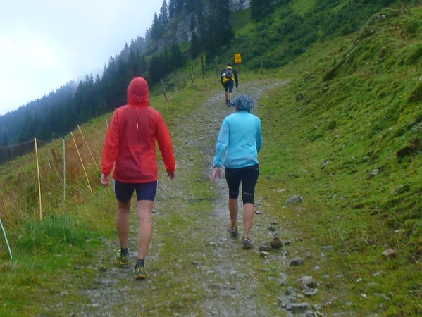 Wir haben die Hälfte geschafft. 35 von 69,3 Km sind absolviert. Ein satter Aufstieg liegt vor uns. Die Sonne kommt nun immer wieder hinaus, allerdings ist der Blick durch Wolken getrübt. Nix zu sehen von Hoher Ifen, Gottesackerwände usw.