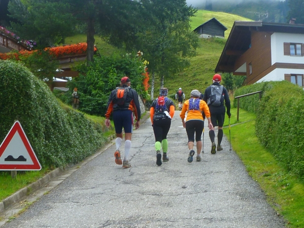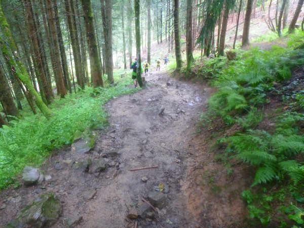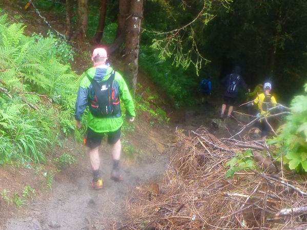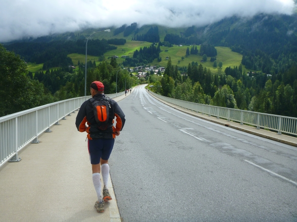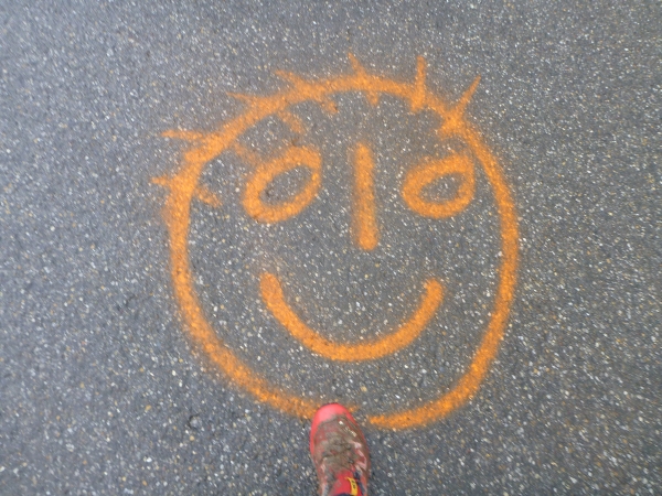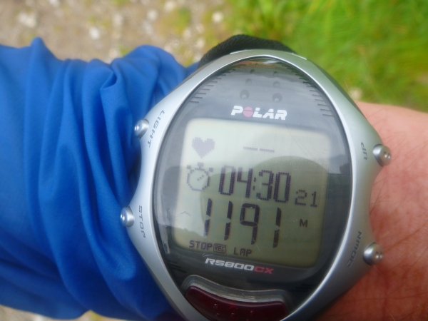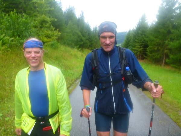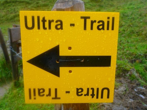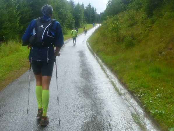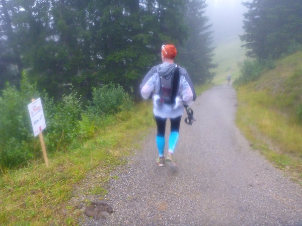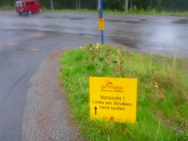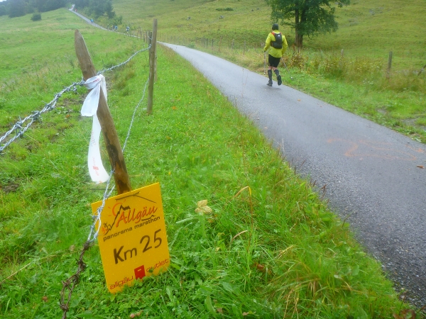 So langsam komme ich in Tritt. Es hat aufgehört zu regnen und es ist etwas wärmer geworden. Ich freue mich auf die nahende Halbzeit. Waren zu Beginn des Rennens noch die Km einzeln beschildert, so kommen die Km-Schilder längst im 5-Km Abstand. 25 und 30 werden passiert.