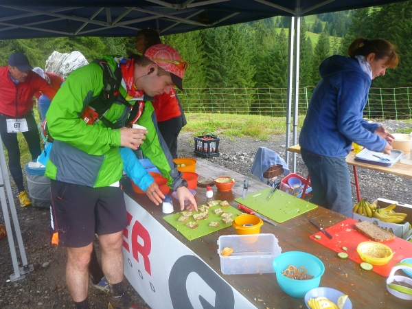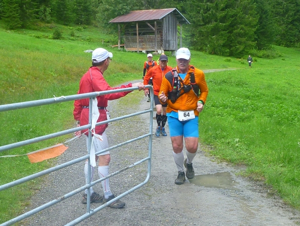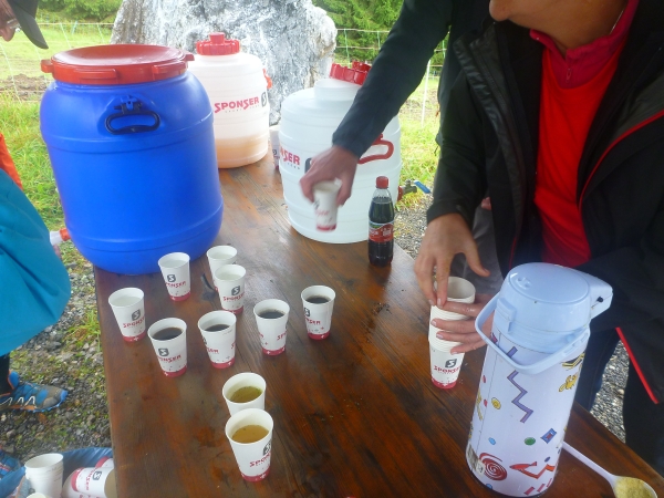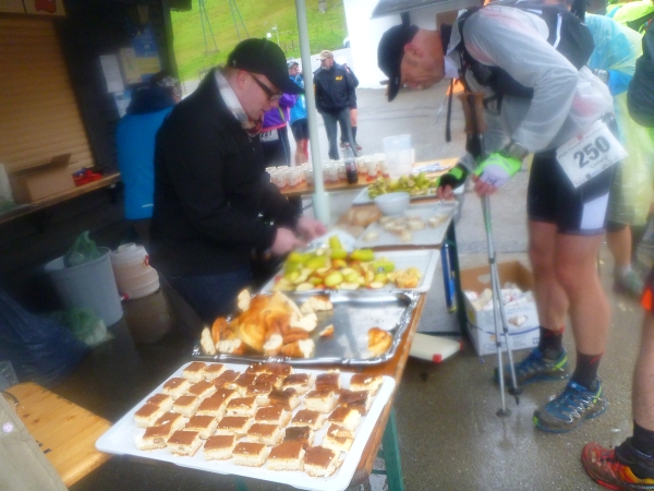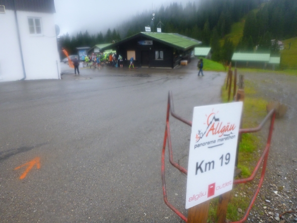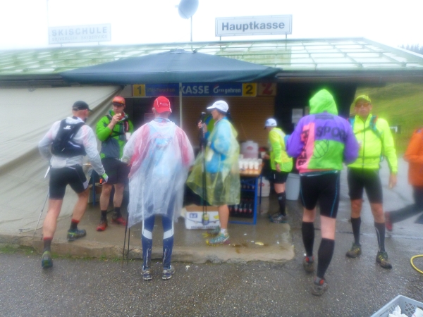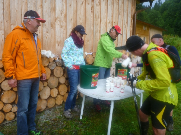 Vor der Grasgehrenhütte ist eine erste Zeitmessmatte zu überlaufen. Der Zeitmesschip ist übrigens in der Startnummer integriert. Die erste Vollverpflegungsstelle erwartet uns. Ich greife gerne beim Kuchen zu. In Sachen Getränke bin ich wieder Eigenversorger mit meiner Apfelsaft-Wasser-Mischung im Trinkrucksack. Erst später werde ich bei Cola zugreifen.
