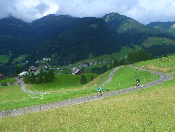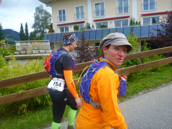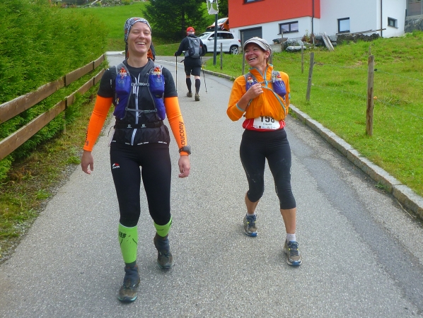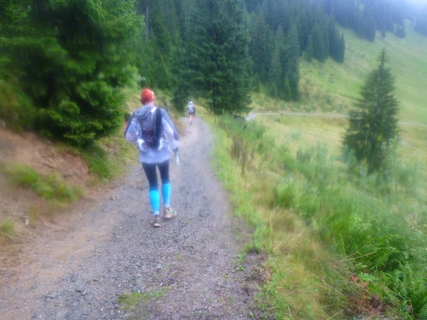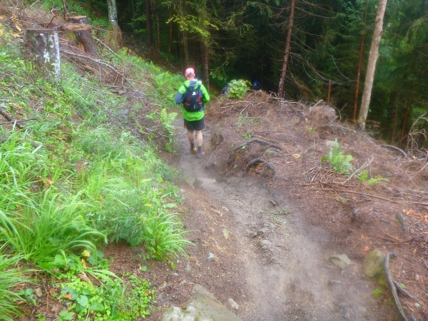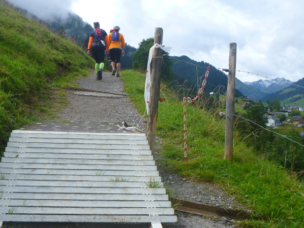 Wir treffen auf einen asphaltierten Weg. Hier scheiden sich die Läuferfelder. Links geht es für die Marathonis weiter, die Ultras laufen rechts vorbei an der Dinigörgen-Alm. Nach einigen weiteren asphaltierten Metern biegen wir links ab. An der Toniskopf-Alm ist damit Schluss, um den Toniskopf herum laufen wir auf herrlichem Terrain, erst Wiese, dann steil hinab im Wald mit viel Steinen und noch mehr Matsch. Höchste Konzentration ist gefragt. Unter uns liegt Rohrmoos. Über eine Weide mit Kühen geht es auf rutschigem Gras steil nach unten.