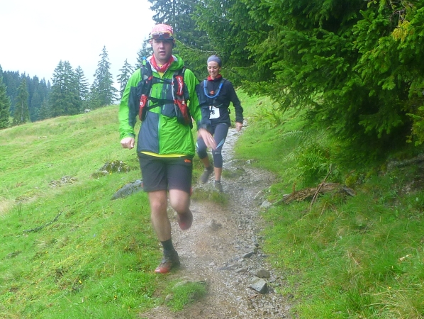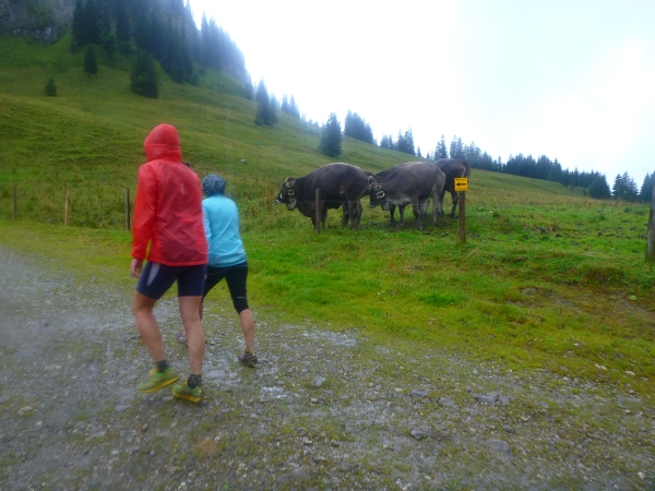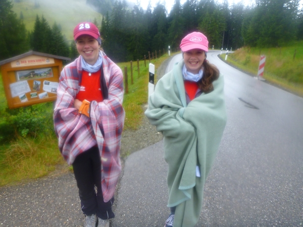 Es geht hinab, eine Straße wird gequert. Die beiden Mädels als Wegweiser sind in dicke Decken gehüllt. An der Schönberg-Alm unterhalb des Beslerkopfs geht es matschig wieder hinauf. Der Schafkopf wird umlaufen. Wieder ein schöner, trailiger Abschnitt.