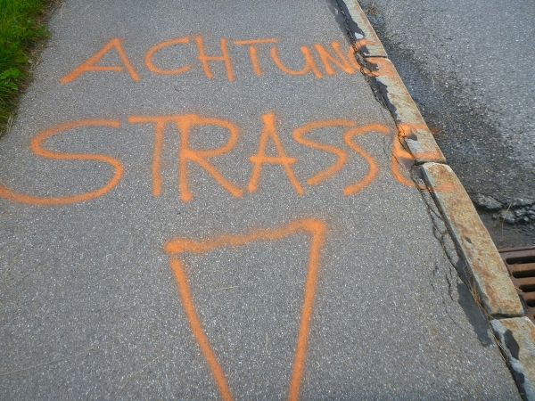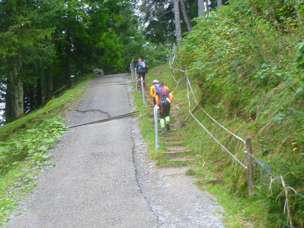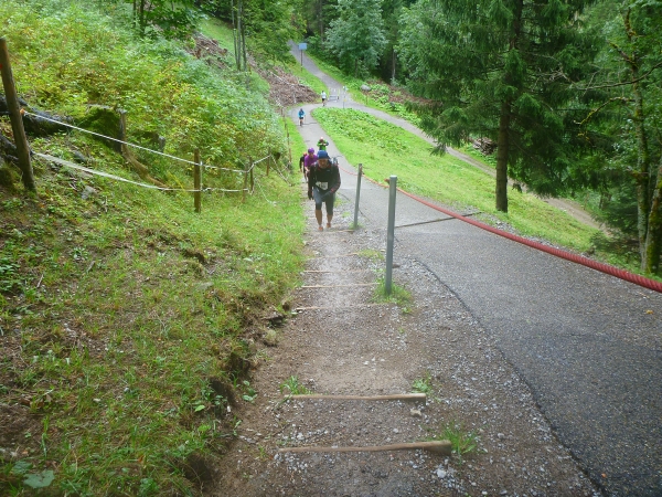 Dort ist wieder eine Getränkestelle. Wir sind bis auf 1070m hinab gelaufen. Eine Asphaltstraße führt uns aus Rohrmoos heraus. Wir biegen links ab und steigen aufwärts auf einer längeren Asphaltstraße. Ich geh den größten Teil des langen Aufstieges.