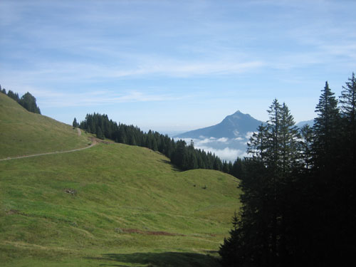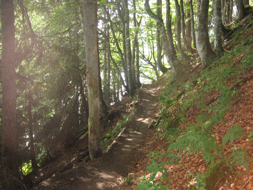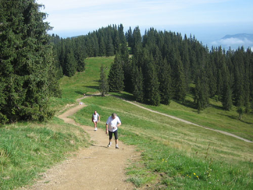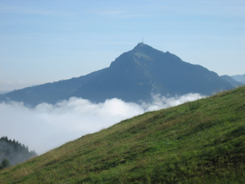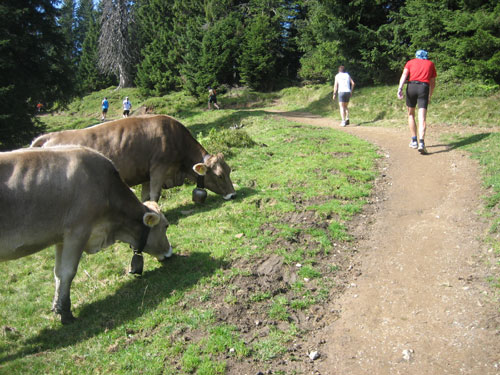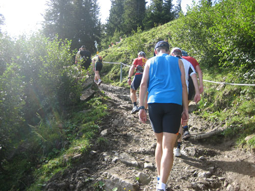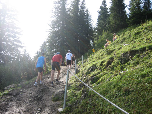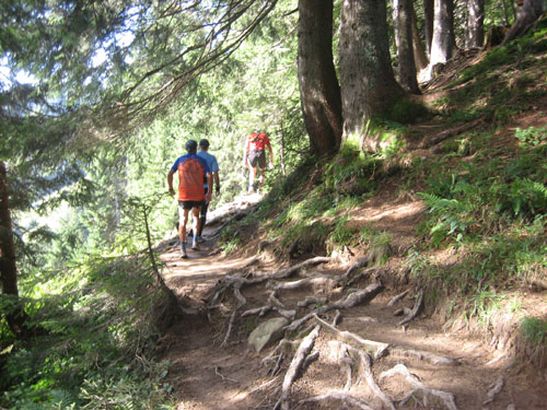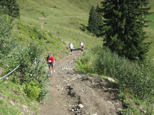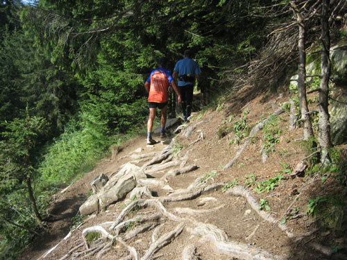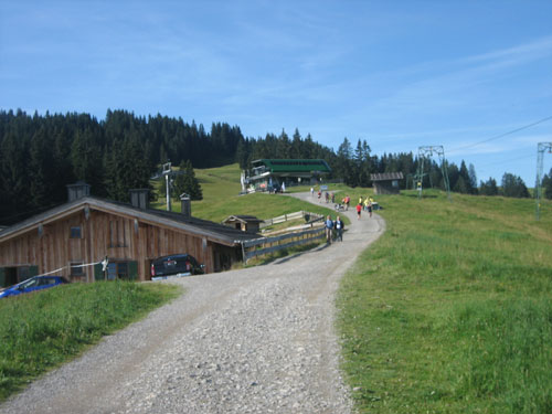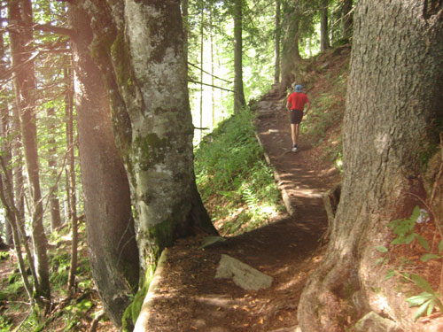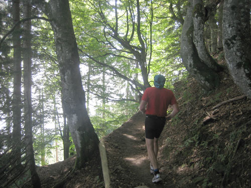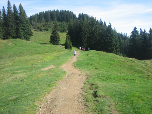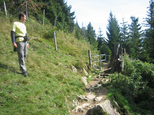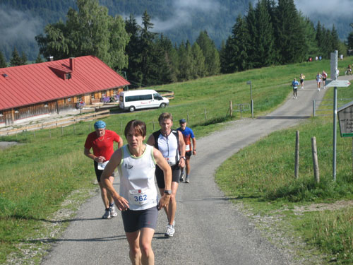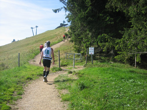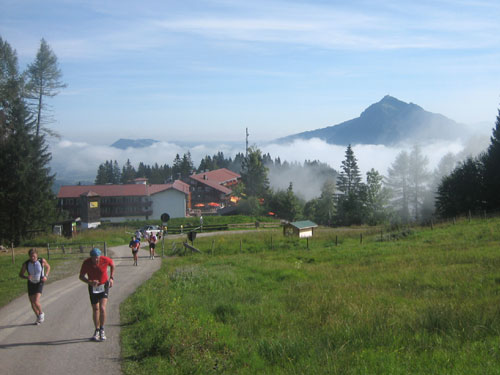 Nach 13 km und 1:43 Std. erreiche ich den Gipfel des Weiherkopfs, zugleich der höchste Punkt der Strecke auf 1665 m. Wer jetzt meint, es folgt beim Bergablauf ein Erholungsstück, wird schnell eines Besseren belehrt. Sausteil, teilweise auf Schotter geht’s die folgenden 500 m runter. Erschwert wird das Ganze noch durch regen Gegenverkehr, denn viele Wanderer sind um diese Uhrzeit unterwegs. Aber wirkliche Probleme gibt es deswegen nicht, man muss aber schon etwas vorsichtig sein.