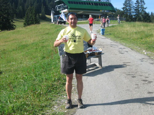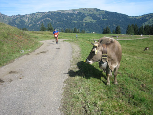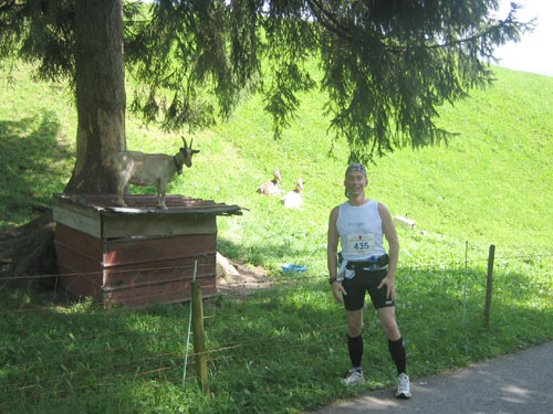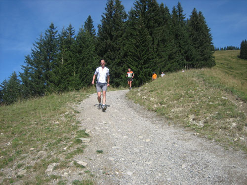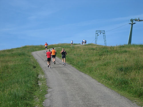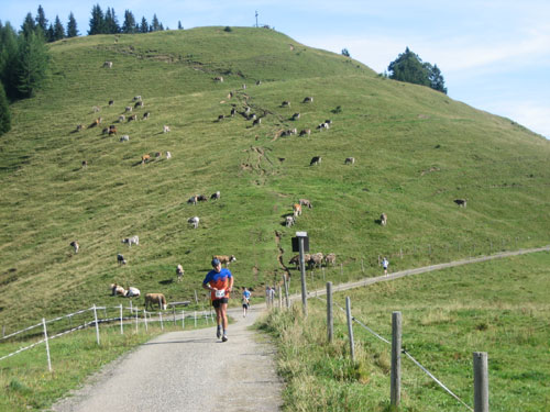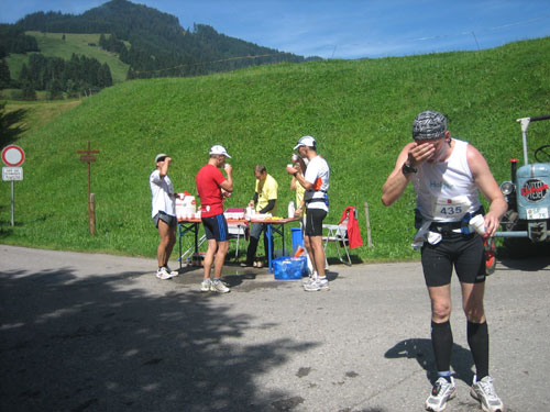 Ab km 32 gibt es auf ca. 500 m Länge etwas Abwechslung in Form einer Begegnungsstrecke, an deren Ende eine Markierung umrundet werden muss, bevor es in entgegen gesetzter Richtung zurück geht. So bietet sich die kurze Gelegenheit, die etwas vor und hinter einem liegenden zu studieren. Vor Rubi geht es querfeldein über eine frisch abgemähte Wiese, auf den folgenden 1,5 km gilt es noch einmal 100 Höhenmeter aufwärts zu überwinden.