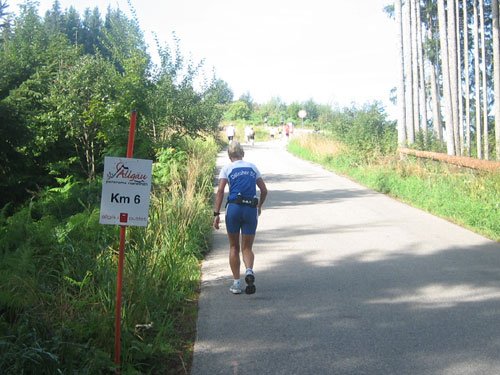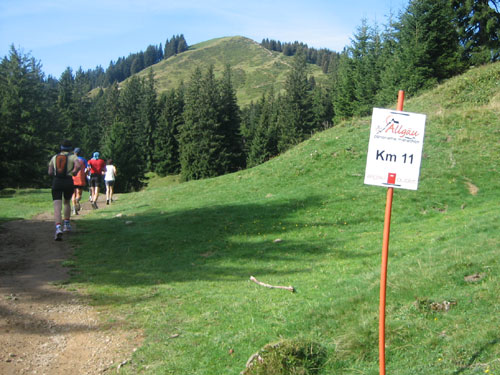 Kurz nach der Verpflegungsstelle bei Weiler (km 27) erreichen wir den Illerdamm. Hier vereinigt sich die Marathonstrecke mit der des Halbmarathon, wie uns deren Ausschilderung unschwer erraten lässt. Im Übrigen ist jeder Kilometer vorbildlich ausgeschildert. Vor dem Ortseingang Fischen werden wir aber wieder nach links abgeleitet in einen Schatten spendenden Wald. Hier ist es recht angenehm zu laufen.