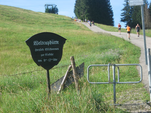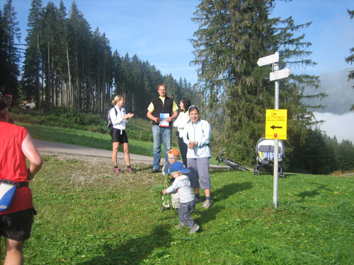 An einer 180 Grad Kurve stehen jede Menge Zuschauer und jubeln uns zu, das steilste Stück liegt hier hinter uns, was folgt ist wieder angenehmer zu laufen. Nach weiteren 500 m führt der Weg über das Berghaus Schwaben für zwei Kilometer wieder tendenziell nach oben. Bei km 16 kommt die Gabelung, die die Marathon- von der Ultra-Trail-Strecke trennt. Für uns Marathonis geht es jetzt fast 10 km nur bergab.