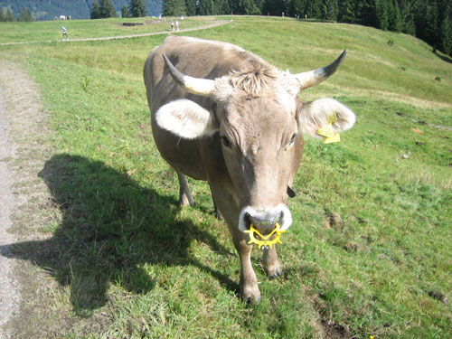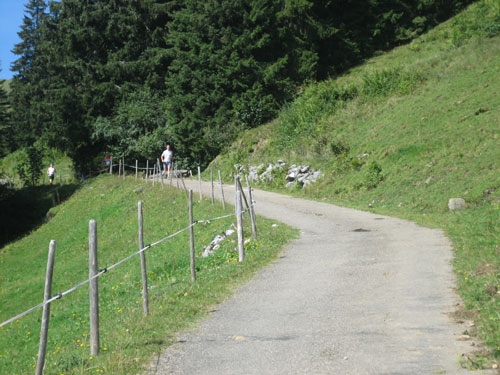 Auf überwiegend Teer- oder guten Wirtschaftswegen schlängeln wir uns in Serpentinen nach unten. Die tiefliegende Wolkenschicht hat sich mittlerweile vollkommen aufgelöst, den Großteil der Piste laufen wir in der prallen Sonne. Mehr Probleme bereitet mir aber nach einigen äußerst anstrengenden Abwärtskilometern meine Schienbeinkante, weswegen ich mein Tempo doch deutlich drosseln muss.