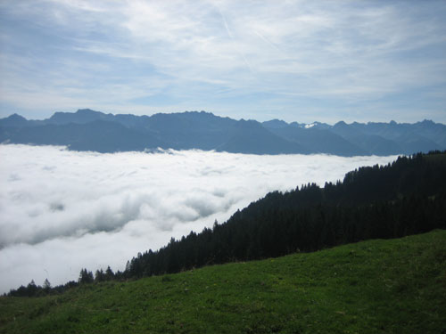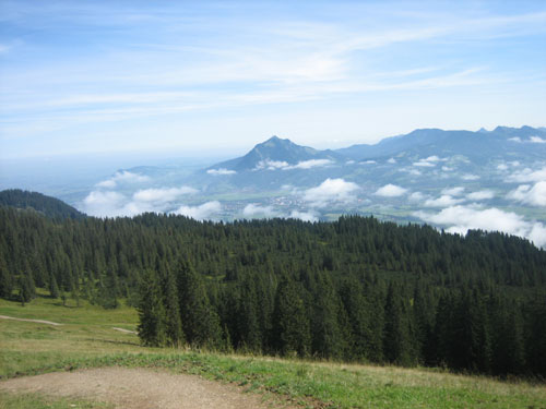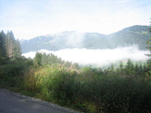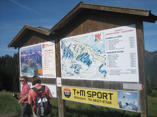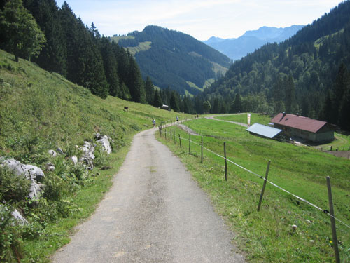 Den Ortseingang von Obermaiselstein passieren wir bei km 25. Typische alpenländische Holzschnittarbeiten kann man hier am Wegesrand beobachten, dann geht’s links rein in den Schatten. In einem größerem Bogen umrunden wir hauptsächlich in Waldgebieten und an einem kleinen Flüsschen entlang die Ortschaft Fischen. Die Temperaturen kann man jetzt spürbar als sommerlich bezeichnen.