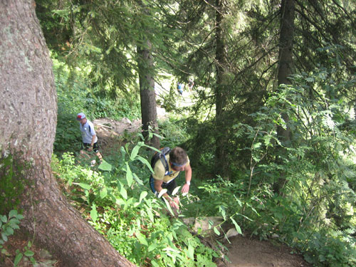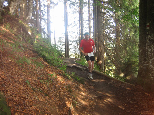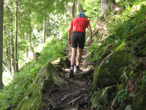 Gleich danach, etwa nach km 10,5 Kilometern beginnt für mich das Sahnehäubchen dieser Strecke. Ein uriger Trail über Wurzeln und Steine führt uns im Wald an einem Hang entlang. Meine Kamera stecke ich mal vorsichtshalber ein, das verlieren des Gleichgewichts könnte nämlich fatale Folgen haben. Links der Strecke geht’s „gach owie“ (O-Ton Bayerisch), was soviel wie „steil nach unten“ bedeutet. Eine herrliche Vegetation mit blühenden Blumen begeleitet uns auf dem Weg.