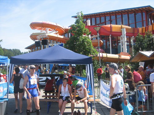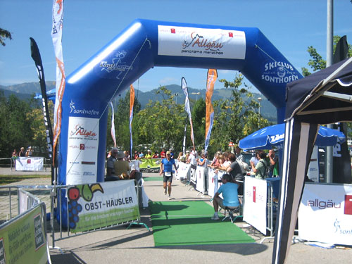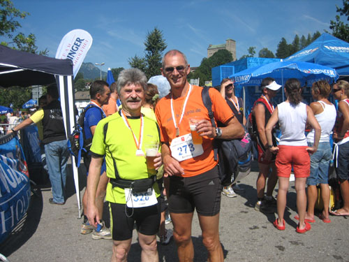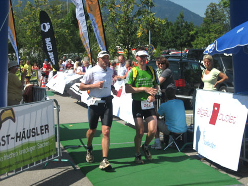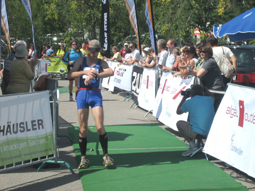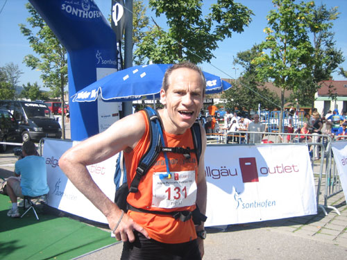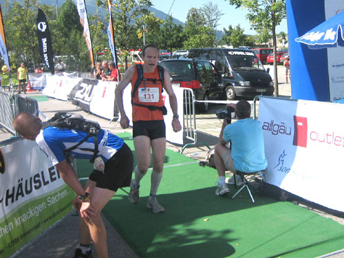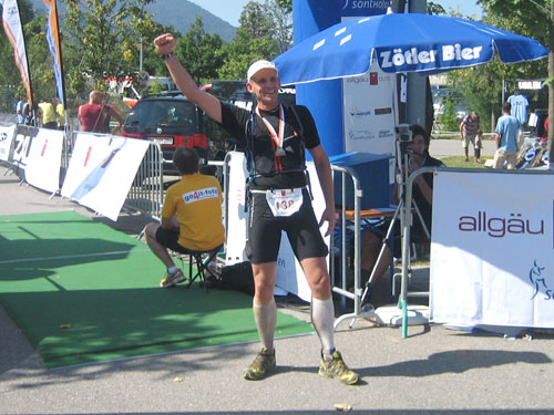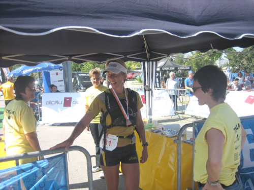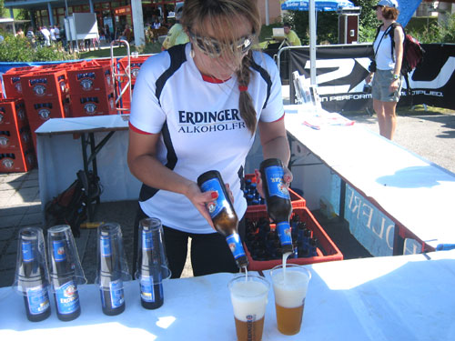 Die letzten fast 6 Kilometer werden auf dem schattenlosen, fast schnurgeraden Illerdamm noch einmal zu einer letzten physischen und für viele wohl auch psychischen Herausforderung, bevor man das Ziel im Wonnemar erreicht. Mit mir treffen auch schon die ersten Ultra-Trail-Bezwinger ein, auf den letzten 20 Meter vereint uns wieder die Strecke. Nach einer Massage warte ich natürlich auf die Zielankunft meiner beiden m4y-Autoren-Kollegen Anton und Daniel. Am Samstag beim Abholen der Unterlagen hab ich mit Anton vereinbart, dass ich ihn im Ziel mit einem Erdinger empfange. Zu meiner Überraschung kommt aber vorher schon Daniel ins Ziel. Den Einlauf hätte ich doch anders rum erwartet. Fast hätte ich mein Versprechen nicht erfüllen können. Je länger die Wartezeit dauert, umso mehr schwinden am heißbegehrten Weissbierstand die Vorräte. Zum Glück für Anton entschließt man sich dort, den begehrten Hopfensaft (natürlich alkohohlfrei) nur mehr an Ultra Trail Finisher auszuschenken, womit ich ihn dann letztendlich doch noch wie versprochen empfangen kann.