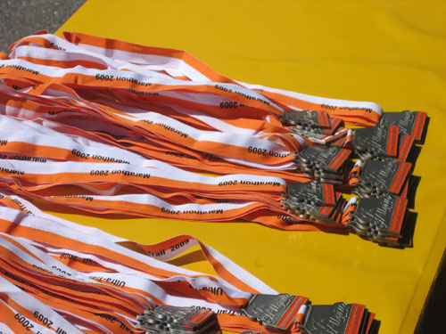 Medaille, Funktions-Shirt, Urkunde aus dem Internet, freier Eintritt ins Wonnemar, diverse Mittelchen zum Einreiben für die geplagte Läufermuskulatur, Massage im Ziel.