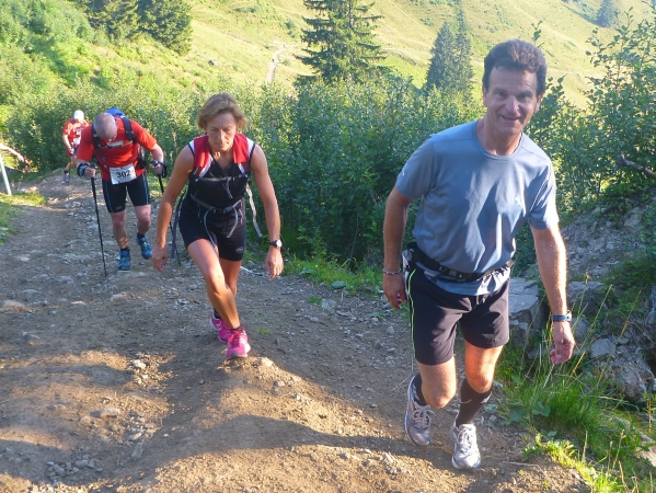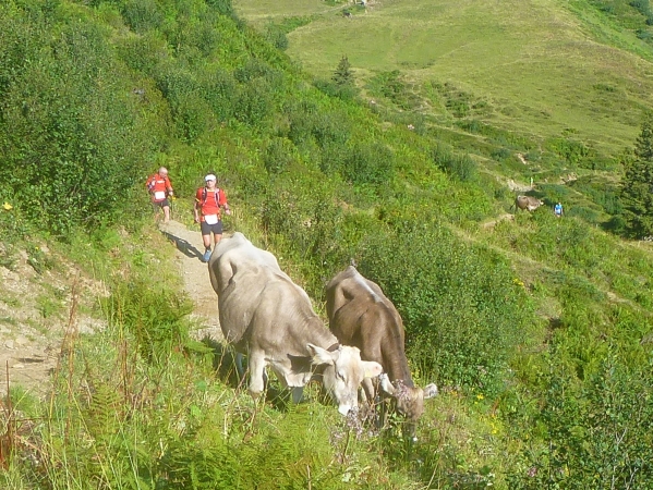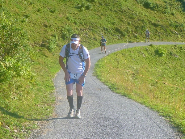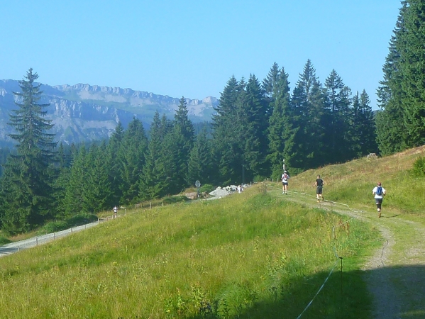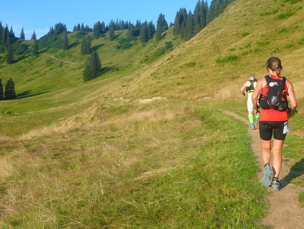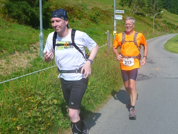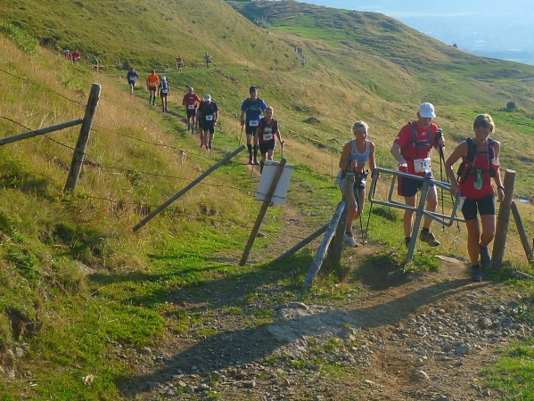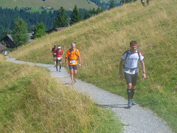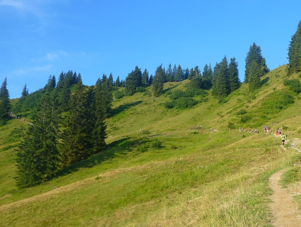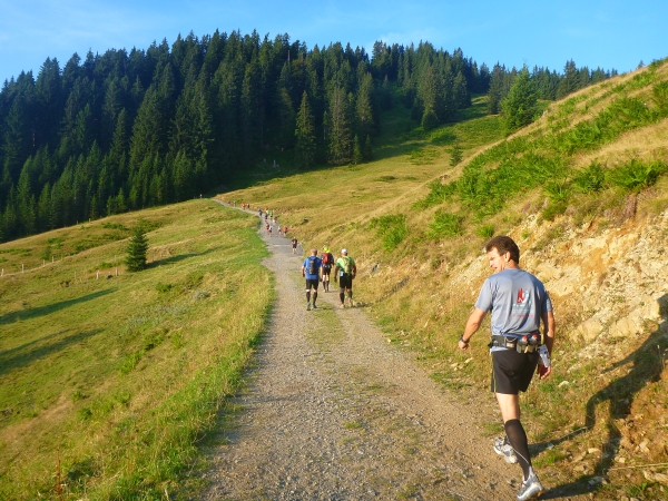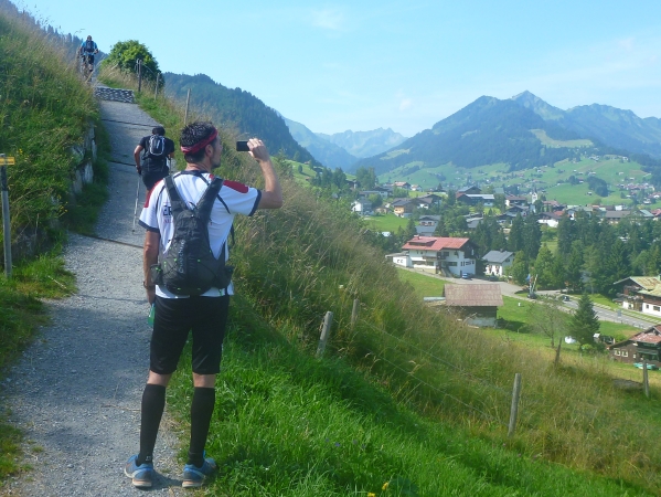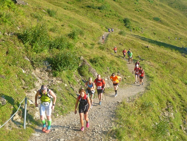 Und wieder können wir die Strecke weit voraus sehen. Es geht auf einen Sattel unterhalb des Riedbergerhorns. Weit voraus sehen wir Läufer als Punkte sich den Berg hinauf kämpfen. Auch wir kämpfen uns hinauf auf den Sattel und werden mit herrlichem Fernblick entschädigt. Vor uns liegen u. a. die markanten Gottesackerwände.