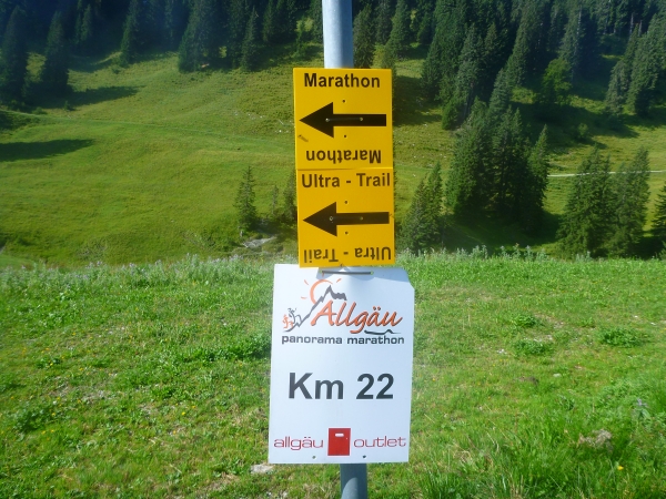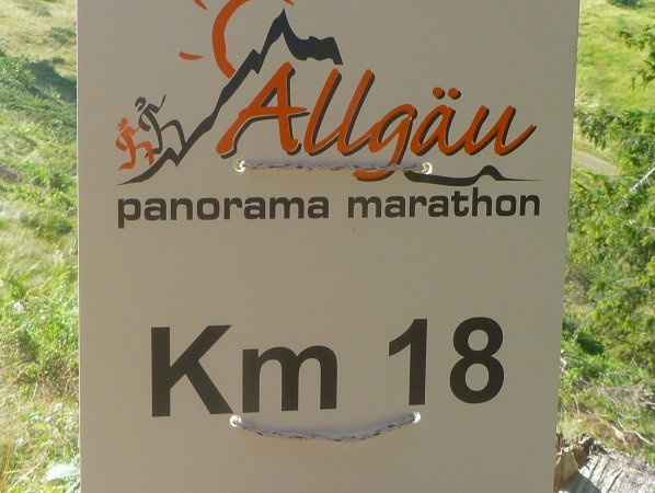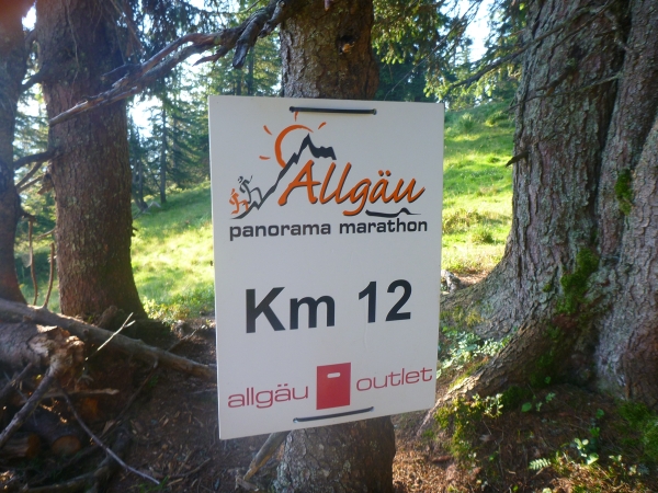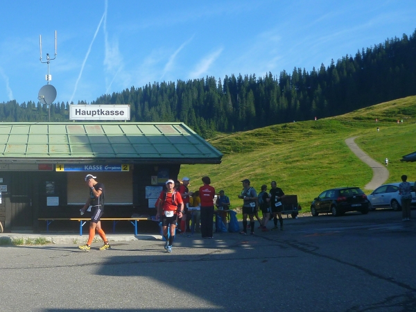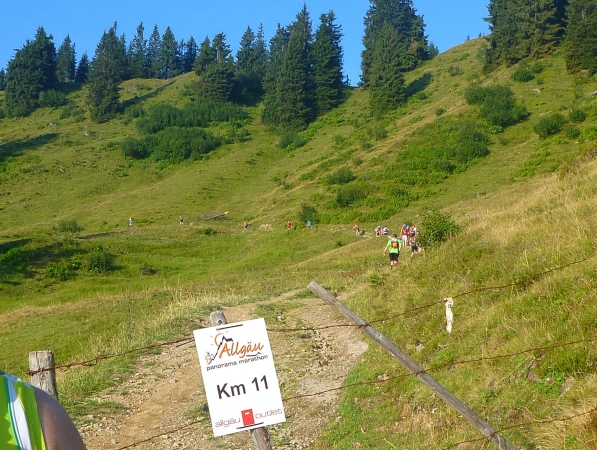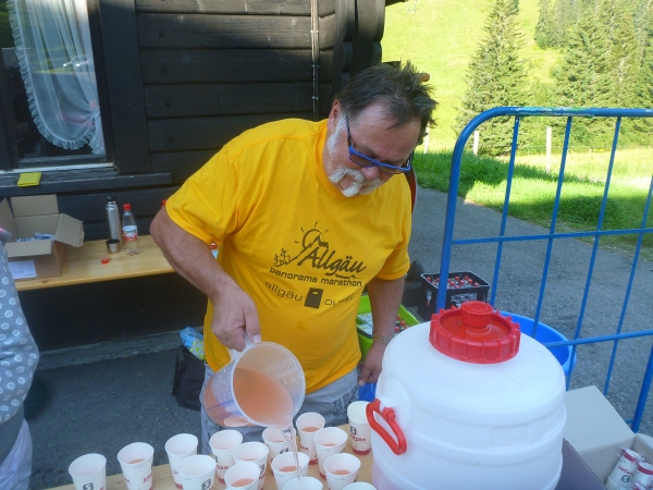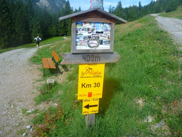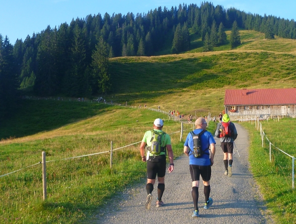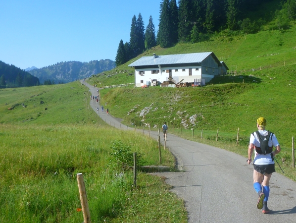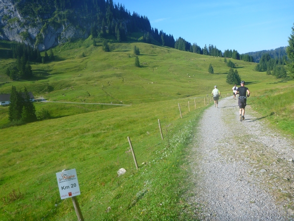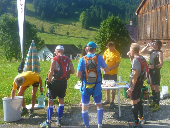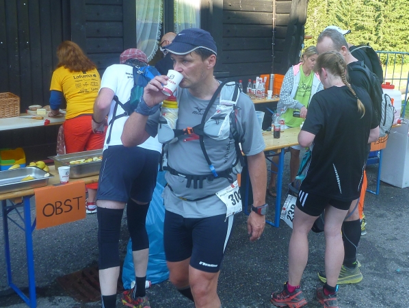 Wir laufen wieder steil abwärts zur Grasgehrenhütte. Die erste Zeitmessmatte ist zu überlaufen. Hoffentlich haben alle den vom Veranstalter gestellten Chip für die Zeitmessung am Fuß. In Grasgehren gibt es die erste Vollverpflegungsstelle. Ein tolles Angebot erwartet uns. Ich nehme Gel und Kuchen. Für Cola ist es mir noch zu früh nach gerade einmal 20 Km. Ich greife mir ein Iso, Wasser mag ich ja nicht trinken beim Laufen. Ich hab ja sowieso wieder meine Lieblingsmischung im Trinkrucksack.