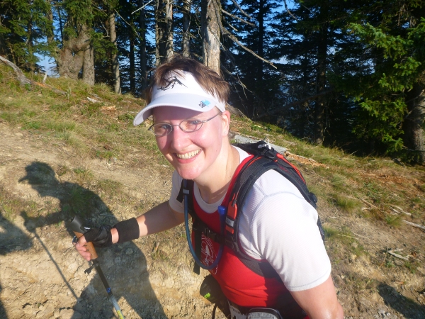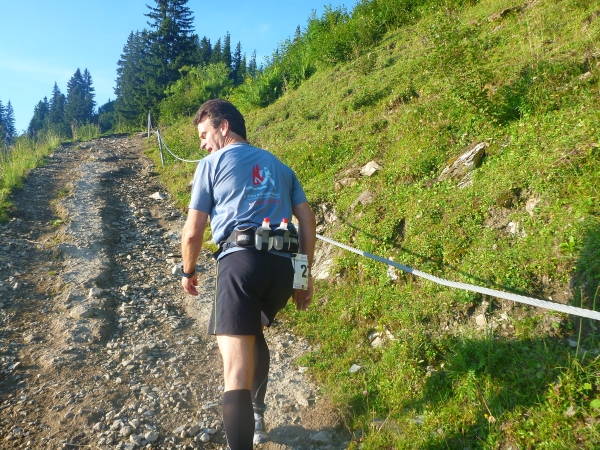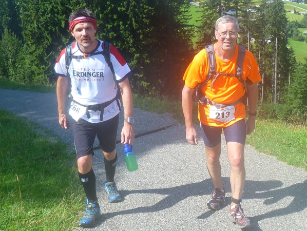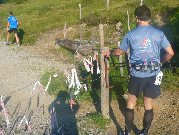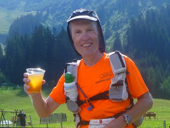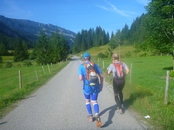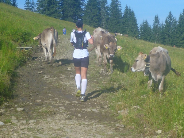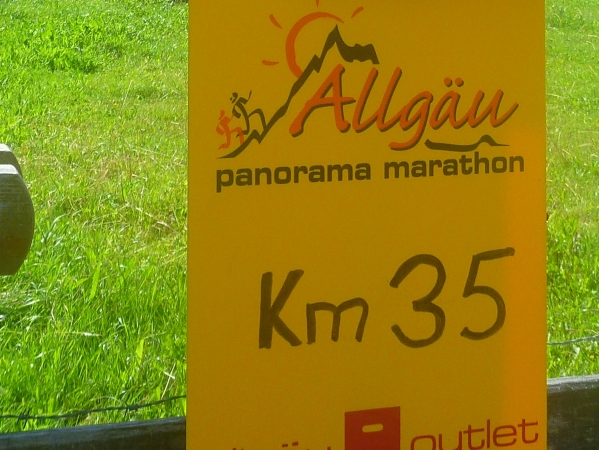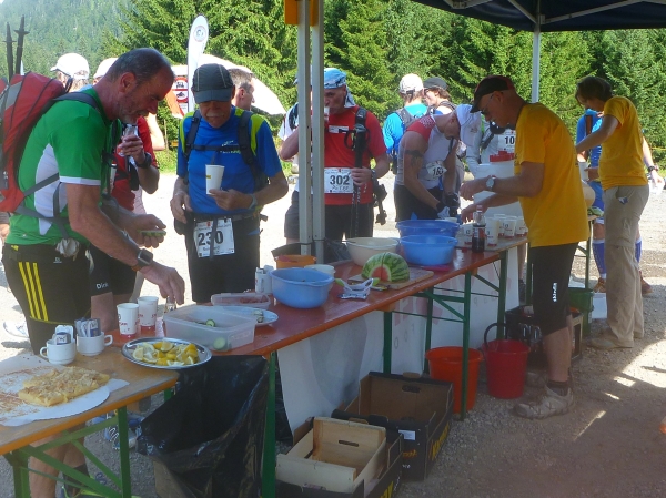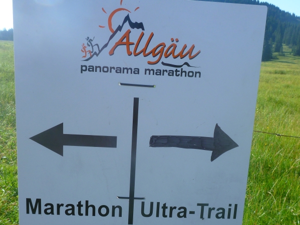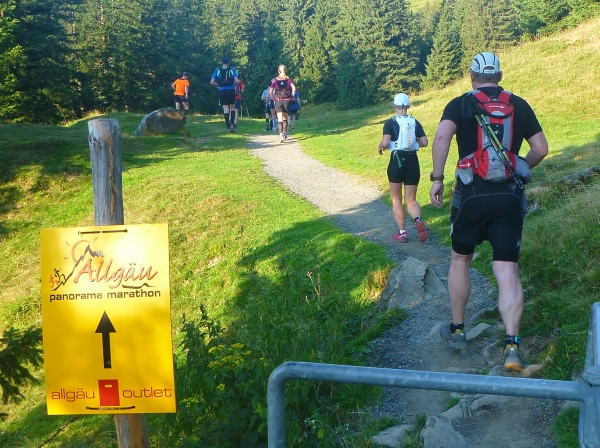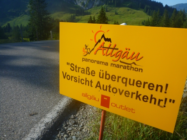 Wir laufen wieder steil abwärts zur Grasgehrenhütte. Die erste Zeitmessmatte ist zu überlaufen. Hoffentlich haben alle den vom Veranstalter gestellten Chip für die Zeitmessung am Fuß. In Grasgehren gibt es die erste Vollverpflegungsstelle. Ein tolles Angebot erwartet uns. Ich nehme Gel und Kuchen. Für Cola ist es mir noch zu früh nach gerade einmal 20 Km. Ich greife mir ein Iso, Wasser mag ich ja nicht trinken beim Laufen. Ich hab ja sowieso wieder meine Lieblingsmischung im Trinkrucksack.