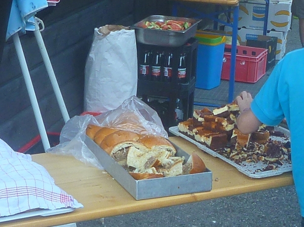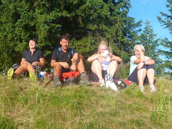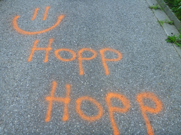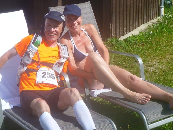 An einer Hütte feuert eine bunte Gesellschaft die Läufer an. Jeder wird stürmisch begrüßt. Ich öffne das Gartentor und trete ein. Sofort erhebt sich ein Jubelsturm und ein freundlicher Mensch stürmt mit einem Bier auf mich zu. Entkräftet wie ich bin, wehre ich mich ich mich gegen die Verführung.