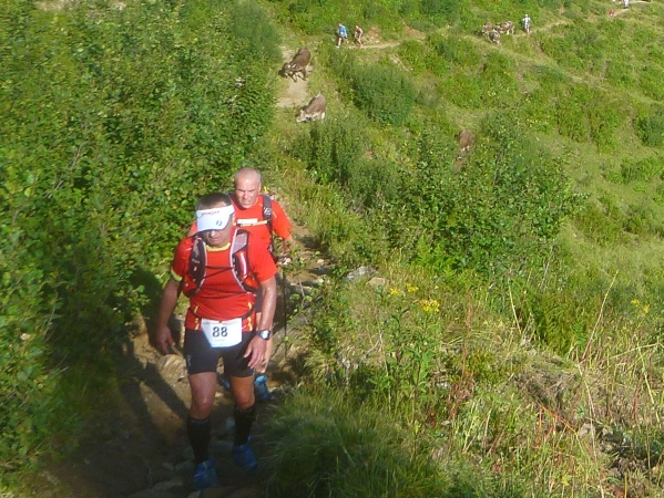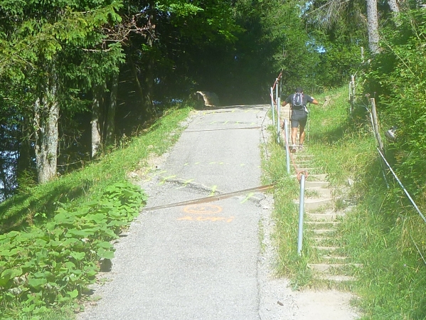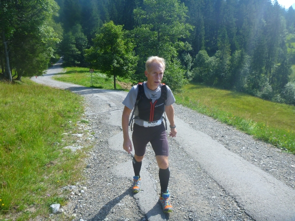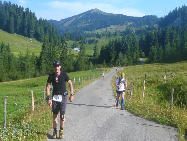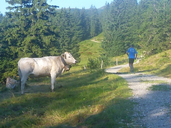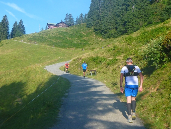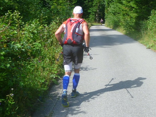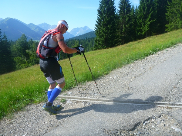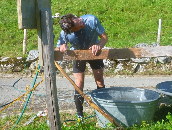 Es geht weiter abwärts. Vorbei an der Schönberg-Alm umlaufen wir den Beslerkopf und kommen zum Abzweig - rechts die Ultras, später links die Marathonis. Nur noch 47 Km. Ein kurzes Stück geht’s auf asphaltiertem Wirtschaftsweg vorbei an der Dinigörgen-Alpe, wo nicht nur Frank sich im Wassertrog am frischen Wasser erfreut und abkühlt.