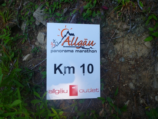 Kurz nach km 10 unterhalb des Sigiswanger Horn müssen wir durch ein Waldstück über Steine und Wurzeln. Trailrunning pur, das volle Aufmerksamkeit erfordert. Endlich ein Gipfel denke ich mir, aber zu früh gefreut. Auf dem Weiherkopf (1665m) wird gebaut. Also müssen wir 10m unterhalb des Gipfelkreuzes rechts in den Wald und den Gipfel umlaufen. Richtig steil laufen wir ab bis kurz vor die Bergstation der Hörnerbahn.