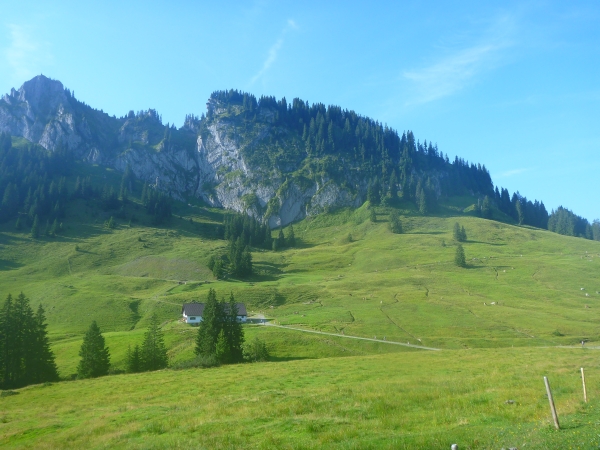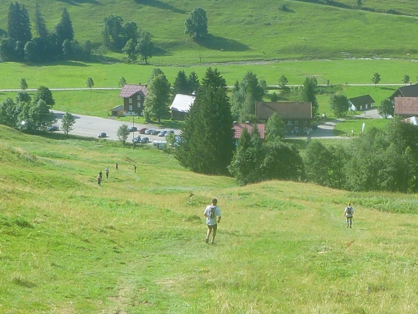 Jetzt gilt es den Schwung in die scharfe Rechtskurve mitzunehmen. Weit voraus sehen wir unterhalb des Großen Ochsenkopfs das Berghaus Schwaben. Vorher geht es natürlich mal wieder abwärts, um dann wieder zum Schwaben aufzusteigen. Es ist ein ständiges Auf und Ab. Irgendwie müssen ja die 3.000 Hm Rauf und Runter zustande kommen.