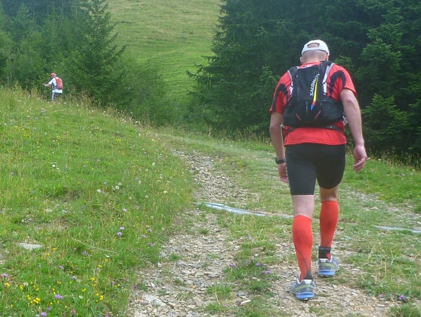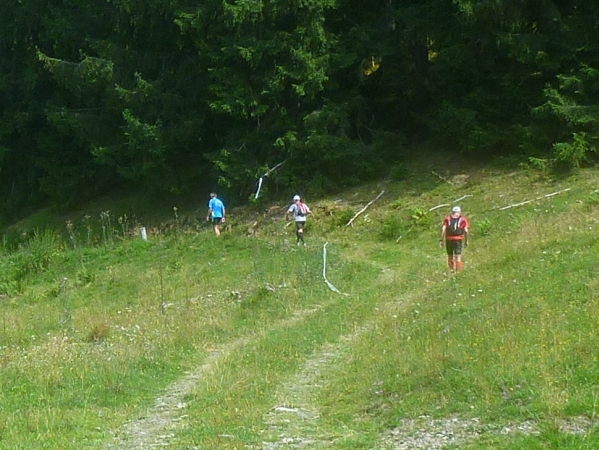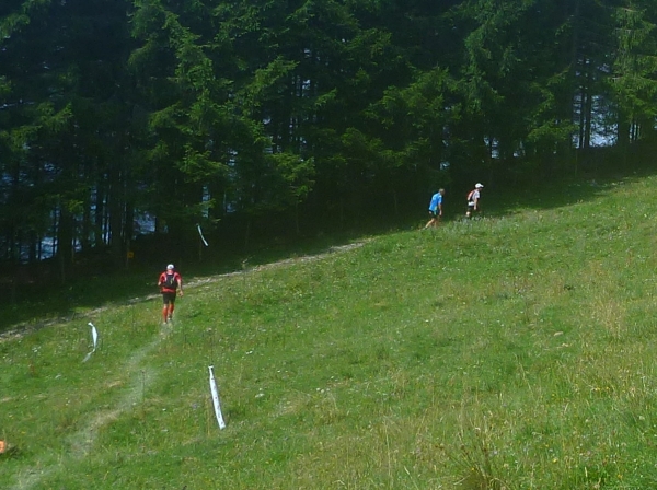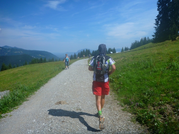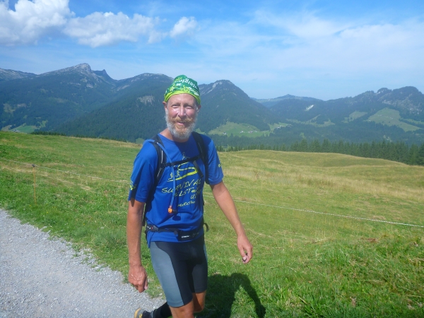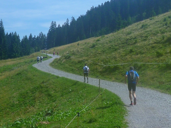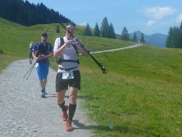 Ich stapfe weiter und werde mental auf eine harte Probe gestellt. Hinter der Gaisalpe wird Km 50 passiert und ich weiß, dass wir von der Gaisalpe auf 1149m Höhe zum Sonnenkopf mit 1712m Höhe einen heftigen Aufstieg zu bewältigen haben. Darauf bin ich eingestellt, nicht jedoch auf das kommende Auf- und Ab. Bevor wir zum steilen Schlußanstieg kommen, ist ein mehrmaliger Verlust an Höhenmetern zu beklagen. Und das Wiedererkämpfen der verlorenen Höhenmeter tut weh. Mehr mental als körperlich, aber egal, ich muss da hoch wenn ich den Ultra erfolgreich beenden will.