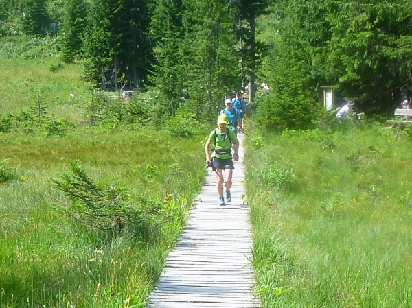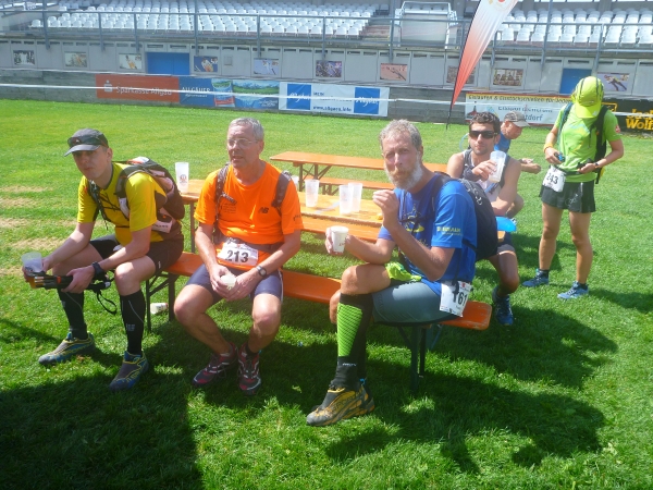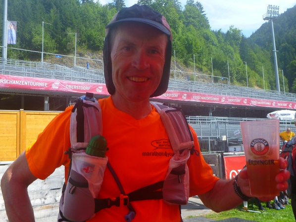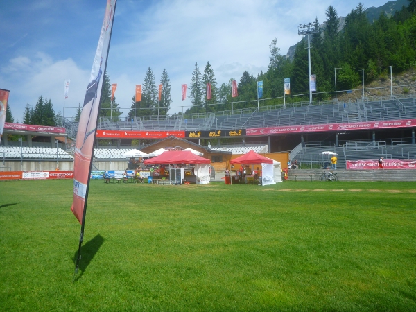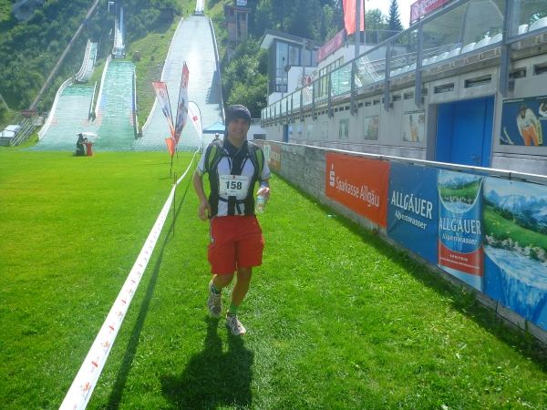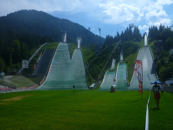 Wer mag, kann hier in der Skisprungsarena den Lauf beenden und bekommt für die 49 Km und 1970 Hm eine Medaille. So mancher muss hier auch unfreiwillig das Rennen beenden, denn nach 8,5 Std. ist um 14.30 Uhr Schluss. Ich bin über eine Stunde vor dem Cut-Off hier. Kein Problem, wie auch schon beim ersten Cut-Off in Grasgehren nach 3.15 Std. Laufzeit. Ist alles machbar.